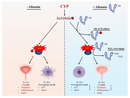 32], although the precise mechanisms and contexts of this protection remain incompletely defined. In the context of CYP-induced cystitis, Alb’s reactivity toward electrophilic aldehydes is particularly interesting. Because ACR is the primary driver of urothelial damage, its sequestration by Alb should attenuate CYP cystitis.
