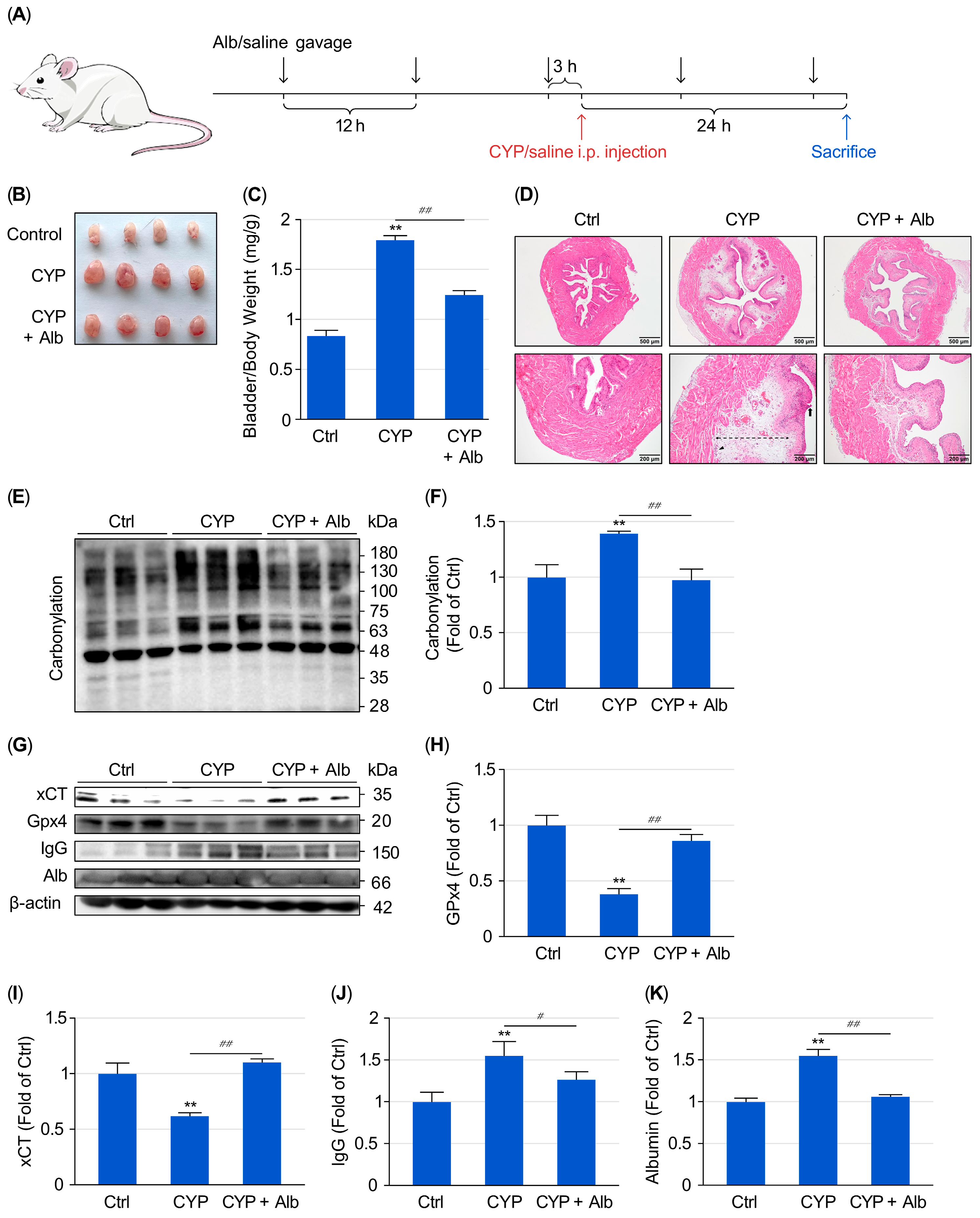 Additionally, the antioxidative activities of Alb, especially its thiol-dependent neutralization of oxidants, could further reduce ACR-induced oxidative stress and thereby suppress downstream lipid peroxidation and ferroptotic pathways. Based on these thoughts, we speculated that Alb could effectively protect against CYP-induced cystitis. However, this hypothesis has not been tested.