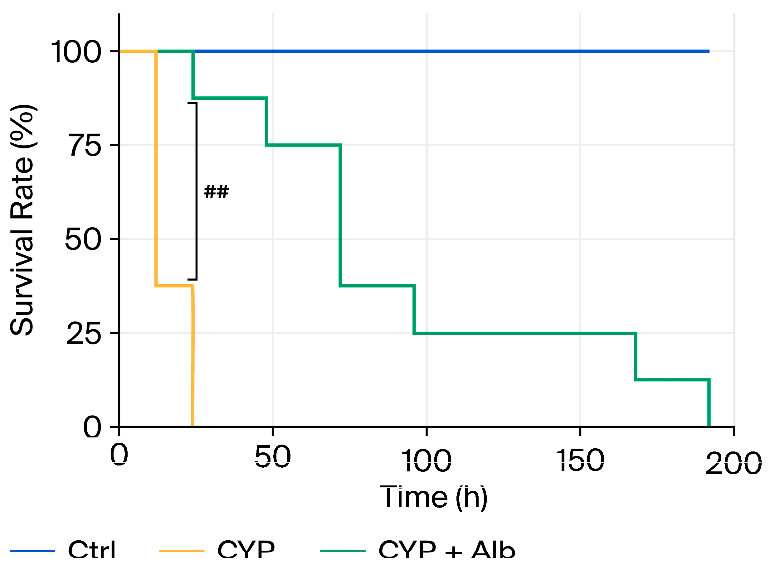 For the high-dose CYP survival study, mice were assigned to the same three groups (n = 8 per group) and treated with or without Alb. CYP was administered i.p. at 20 μL/g (600 mg/kg). These doses were chosen based on our pilot data showing that 600 mg/kg produced 100% mortality within 24 h. Survival at different groups was monitored at regular intervals until all mice had died.
