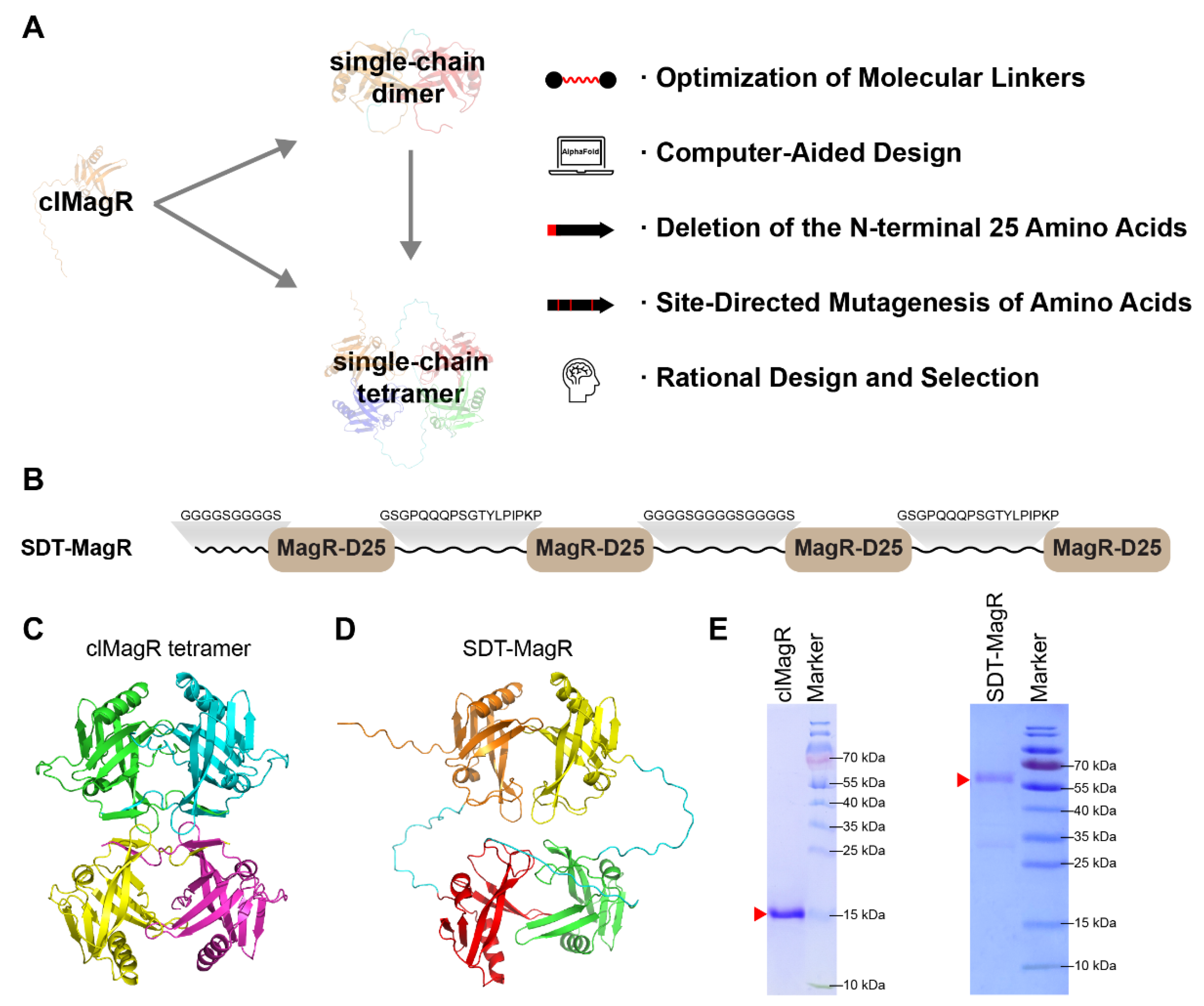 Here, we rationally designed and systematically generated a series of single-chain MagR variants to improve magnetic strength, stability, and self-assembly. Two complementary strategies including single-chain dimer and single-chain tetramer designs were employed across nine iterative rounds of design and validation, generating 25 distinct constructs. Each variant was then expressed, purified, and characterized. Several key biochemical and biophysical features including the iron–sulfur cluster binding, protein stability, oligomeric assembly, and magnetic property were used for screening and evaluation. Among these, one particular variant, SDT-MagR, designated as Single-chain-Dimer-based Tetramer MagR, was sorted out during this process, with remarkably prolonged protein stability, strong protein assembly capability and enhanced magnetism.