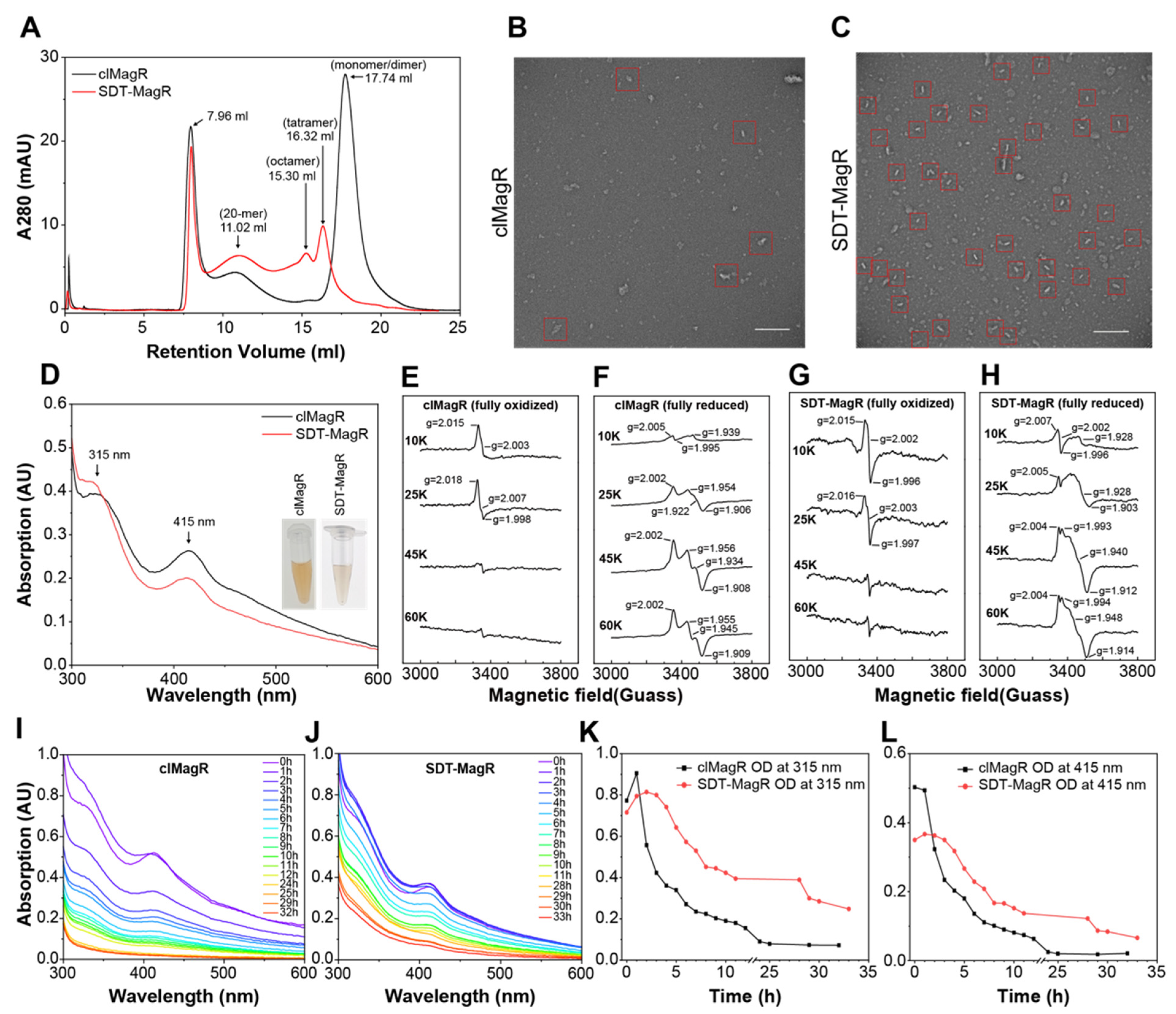 43]. Through rational protein engineering, we demonstrate here that enhancing MagR structural stability and promoting oligomerization can substantially amplify its magnetic properties. The engineered SDT-MagR, composed of four covalently linked MagR subunits, seems to retain the Fe–S cluster binding capacity and rod-like architecture of clMagR polymerization, while exhibiting significantly enhanced thermal stability and magnetic susceptibility.