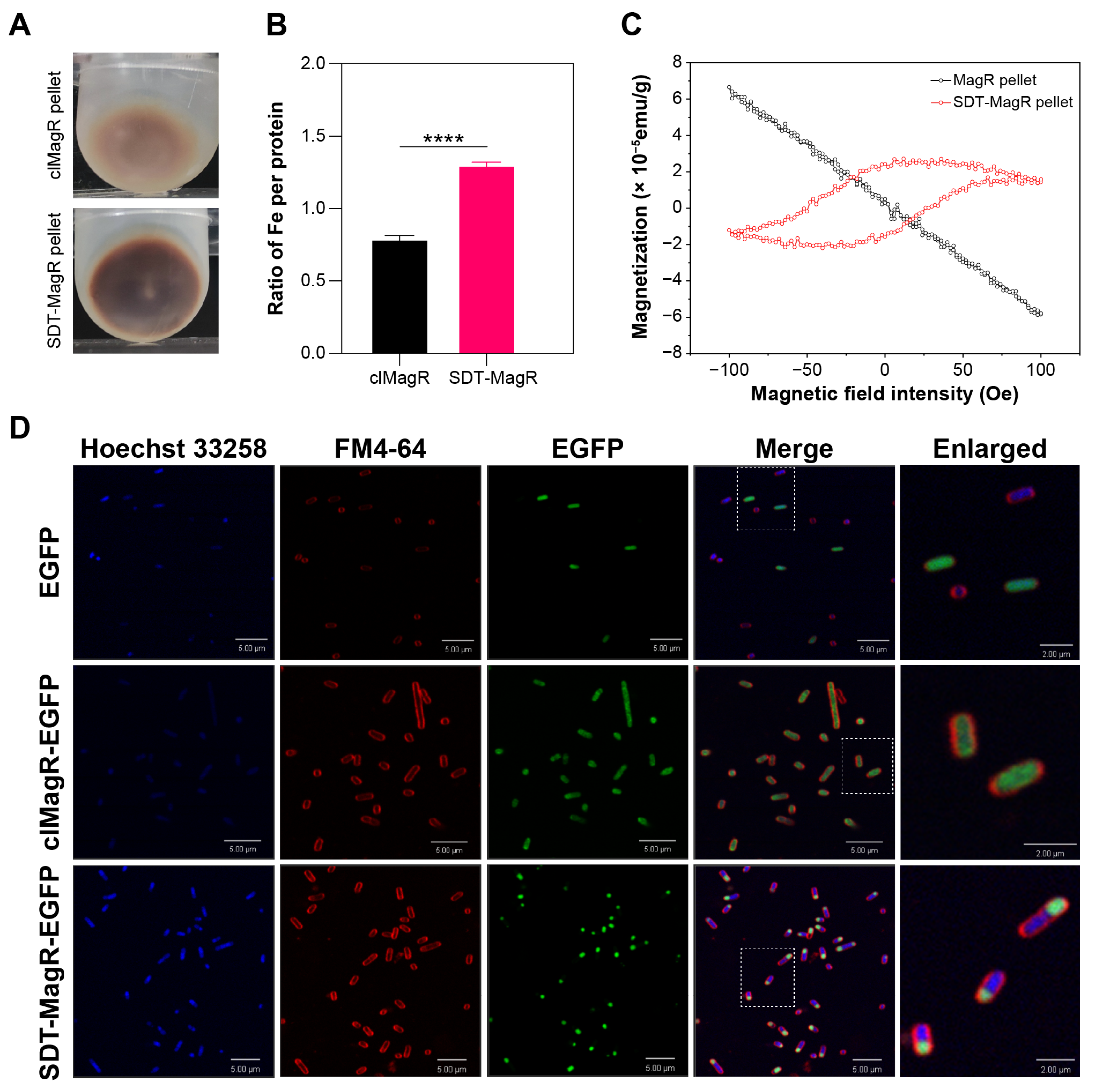 Following induction of EGFP, clMagR–EGFP, and SDT–EGFP as described above, bacterial cells were harvested by centrifugation. The cell pellets were washed three times with ddH2O to remove residual culture medium, followed by a final centrifugation to remove excess ddH2O. In a darkened room, the pellets were resuspended in 100 µL of Hoechst 33258 (20 µg/mL in ddH2O) and incubated at room temperature in the dark for 20 min. After centrifugation to remove the staining solution, the pellets were resuspended in 100 µL of FM4–64 (20 µg/mL in DMSO) and incubated on ice in the dark for 3 min. Finally, 90 µL of the dye solution was removed by centrifugation, and the remaining cell suspension was gently resuspended by pipetting and spread onto glass slides for fluorescence imaging. All fluorescence images were acquired using a laser scanning confocal microscope (Leica Microsystems, Wetzlar, Germany).