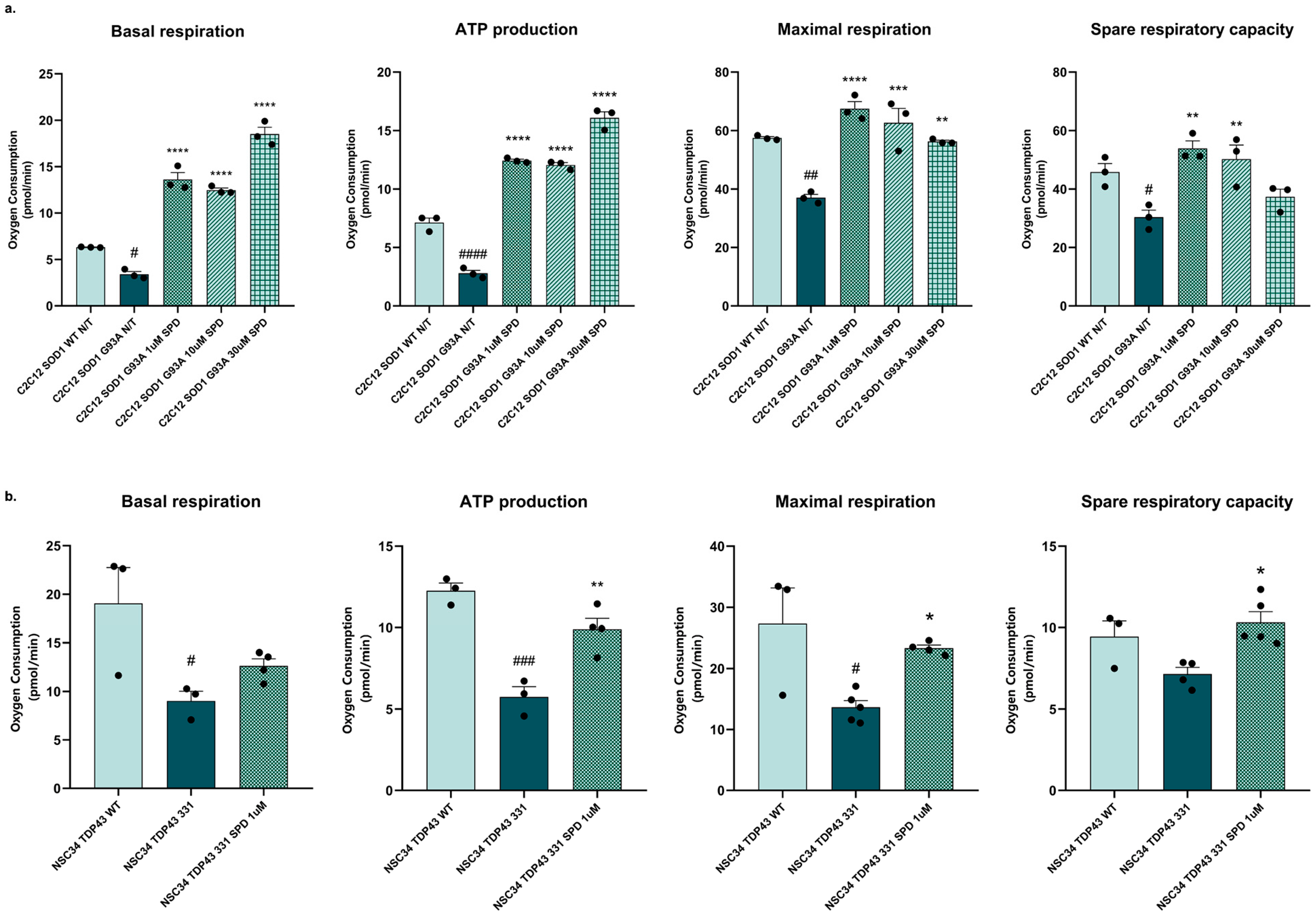 3.3. Spermidine Treatment Improves Mitochondrial Metabolism in ALS Cellular Model and Muscle Force in ALS Mouse Model