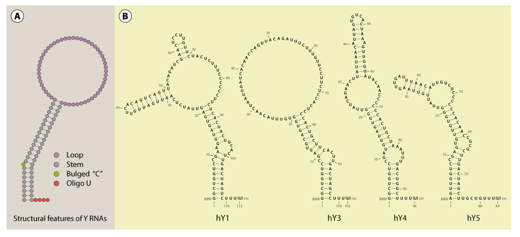 Y RNAs were originally identified in the 1980’s by immunopurification with auto-antibodies from patients suffering from systemic lupus erythematosus []. The proteins Ro60 (TROVE2, SSA) and La (SSB), which are common auto-antigens in autoimmune diseases (like systemic lupus erythematosus and Sjögren’s syndrome (reviewed in []), were identified as the major antigens facilitating the association with these small ncRNAs [,,]. Subsequently, these cytoplasmic ncRNAs were named Y RNAs to distinguish them from nuclear U RNAs, another major class of small ncRNAs in the cell [,].