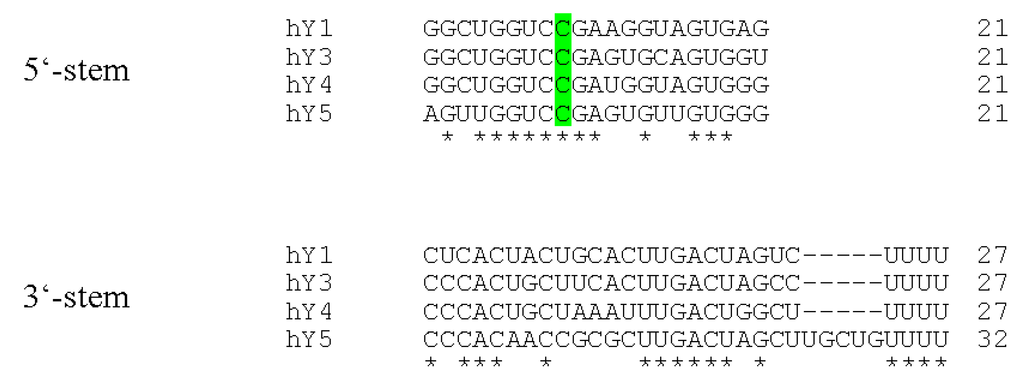 Sequence alignments of human Y RNA stems. The terminal Y RNA stem sequences were aligned using the TCoffee web server [,]. Perfectly conserved nucleotides are marked with asterisks. The remarkably conserved cytosine base at position 9 within the 5’-part of the Y RNAs is highlighted in green.