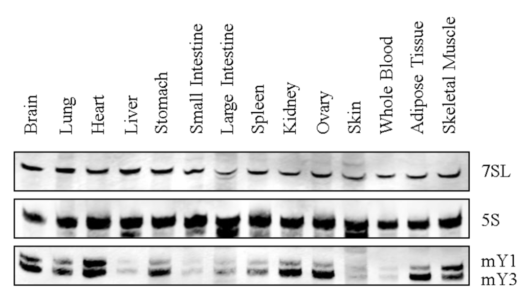 Y RNA expression has been reported in various species, including primary tissue and tumor-derived cell lines [,]. However, comprehensive analyses of tissue-specific Y RNA expression profiles are still lacking. Therefore, we analyzed the expression of murine Y RNAs in several adult tissues by Northern blotting (Figure 3). These studies revealed basal expression of murine Y RNAs (mY1 and mY3) in all analyzed tissues. Y RNA abundance varied significantly, with high levels observed in the brain, lung, heart, stomach, kidney, ovary, adipose tissue and skeletal muscle, in contrast to lower mY RNA abundance in the liver, gut, spleen, skin and blood. Intriguingly, the observed mY RNA expression pattern correlated to the expression signature of Ro60 []. This supports the view that the Y RNA-Ro60 complex co-evolved and that the protein is essential for Y RNA stabilization [,]. In humans, Y RNAs were shown to be significantly upregulated in a variety of tumors, for instance, bladder and kidney carcinomas. Moreover, Y RNAs promote cell proliferation, which is supported by reduced cell cycle progression upon siRNA-directed Y1 and Y3 depletion [,]. Little is known about the developmental expression of Y RNAs, which was analyzed exclusively in Xenopus laevis and Danio rerio, where Y RNA levels increased after the midblastula transition (MBT, []). Notably, the inhibition of Y RNAs by antisense morpholinos led to lethal developmental defects after MBT before gastrulation.