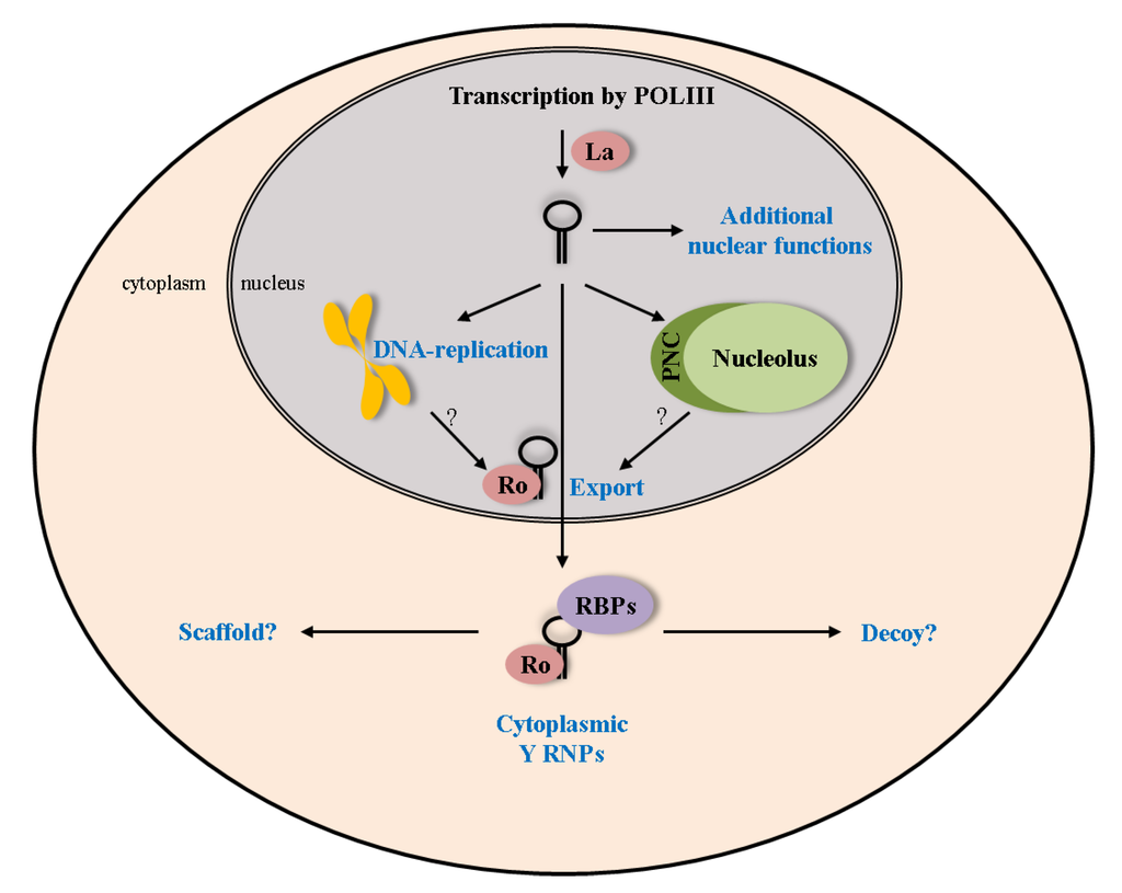 Lifecycle of Y RNAs. The proposed cellular functions of Y RNAs rely mostly on the association with their core proteins Ro60 and La. These interactions influence various parts of the Y RNA lifecycle (e.g., nuclear export together with Ro60). Additional functions and interactions with RNA binding proteins (RBPs) have to be assumed in the nucleus, as well as the cytoplasm.