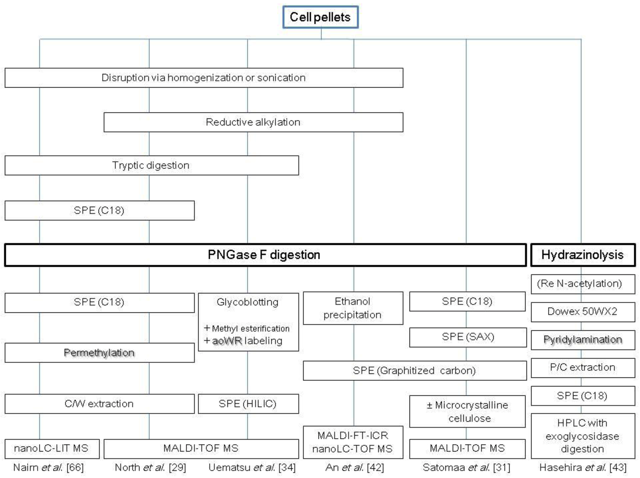 Considering that quantitative cellular N-glycomics relies on highly efficient and reproducible liberation of oligosaccharides from cellular glycoproteins, it is important to maximize the efficiency of N-glycan liberation. Glycoproteins differ widely in their susceptibility to enzymatic digestion, since glycosylated sites are often obstructed by secondary and tertiary protein structures. Therefore, differences in the conditions of de-N-glycosylation by PNGase F may cause alterations in liberation efficiency. For example, preparation of tryptic glycopeptides and reductive alkylation facilitate the release of N-glycans via PNGase F digestion [23].