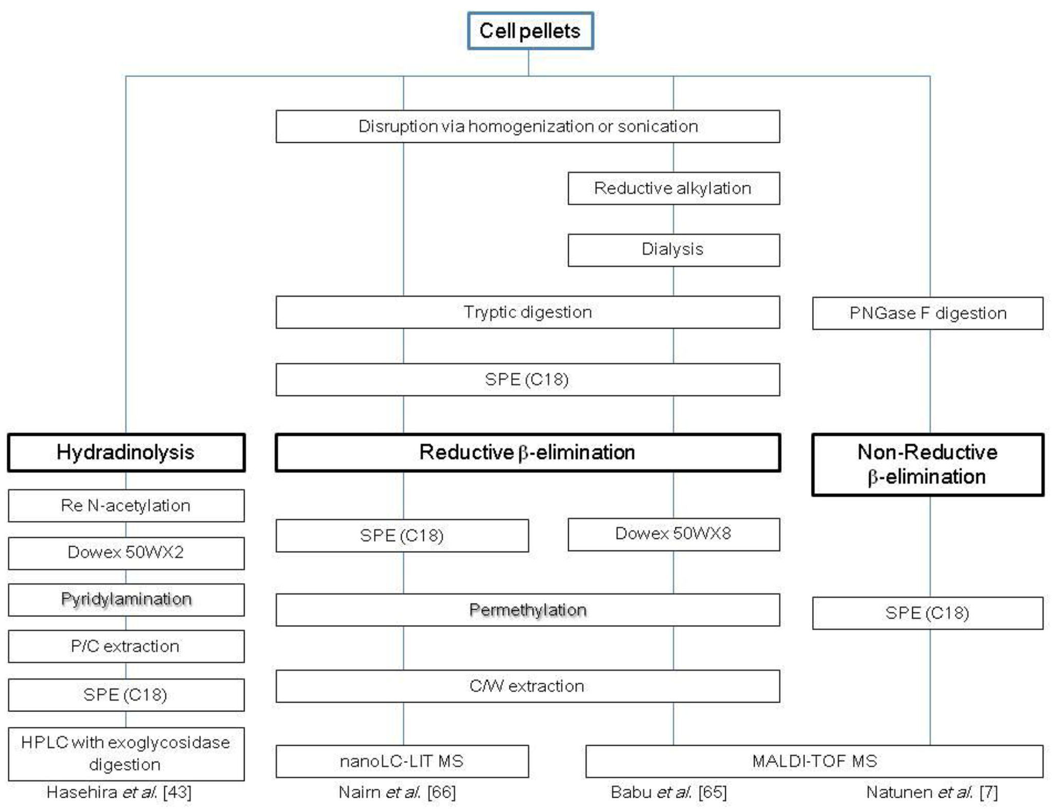 Reductive β-elimination, reported in 1968 by Carlson [64], is still the most reliable technique for liberation of O-glycans and has proven to be a feasible method for cellular O-glycomic analyses. Reductive β-elimination releases O-glycans in their reduced form (alditol form) as a result of immediate in situ reduction by sodium borohydride. Reduction of the innermost sugar to alditol minimizes the side peeling reaction. One limitation of this method is that reduction causes a loss of the reducing end of the carbohydrate, which precludes additional downstream glycomic analysis, such as derivatization suitable for enrichment, chromatographic and mass spectrometric analyses. Using the reductive β-elimination technique combined with MALDI-TOF analysis, Babu et al. reported the structural characterization of neutrophil O-glycomics [65]. Glycoproteins from human neutrophil cells were subjected to reductive carboxymethylation followed by digestion with trypsin. O-glycans were then released from tryptic glycopeptides by reductive β-elimination, and purified glycans by Dowex 50W-X8 were permethylated to enhance the sensitivity of MS detection. The O-glycomic profile consisted of core 1 and core 2 O-glycans with sialyl Lex and Lex as non-reducing terminal epitopes. The same technique was also used to determine the O-glycomic profile of parent and glycosylation mutant CHO cell lines [29]. The O-glycans from both wild-type (parent) and mutant CHO cell lines showed a simple set of core 1 structures comprising T-antigen, sialylated T and di-sialylated T. Nairn et al. reported the O-glycomic alteration of mouse ES cells upon differentiation into embryoid bodies or extraembryonic endodermal cells [66]. In this study, 28 types of O-glycans were identified, including mannosyl-, fucosyl- and glucosyl-type O-glycans. The authors of this study concluded that changes in glycan structures correlated with alterations in transcript abundance of the corresponding biosynthetic enzymes, suggesting that transcriptional regulation contributes significantly to the regulation of glycan expression. Maniatis et al. reported microwave-assisted reductive β-elimination using dimethylamine, which enabled short-time quantitative release of O-glycans from model glycopeptides and glycoproteins [67].
