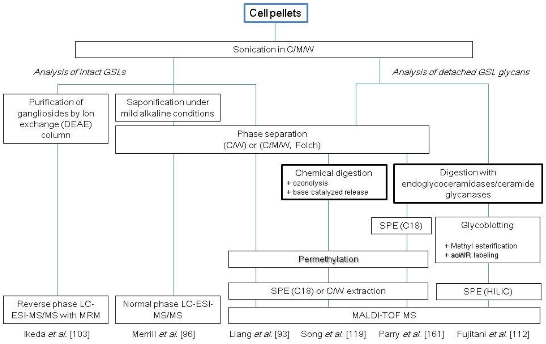 Among various glycoconjugates, glycomic analyses of GSLs have been performed extensively using thin layer chromatography (TLC) since the mid-1960s. Recently, MS analysis has played a principal role in the structural and quantitative analysis of GSLs. Of the two major approaches, which include analysis of the intact form of GSLs and analysis of the glycan moiety upon deglycosylation, the former approach provides valuable information regarding both glycomics and lipidomics simultaneously.