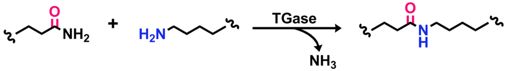 Amide bond formation catalyzed by TGase. Peptide- or protein-bound glutamines and lysines serve as substrates, releasing ammonia in the process.