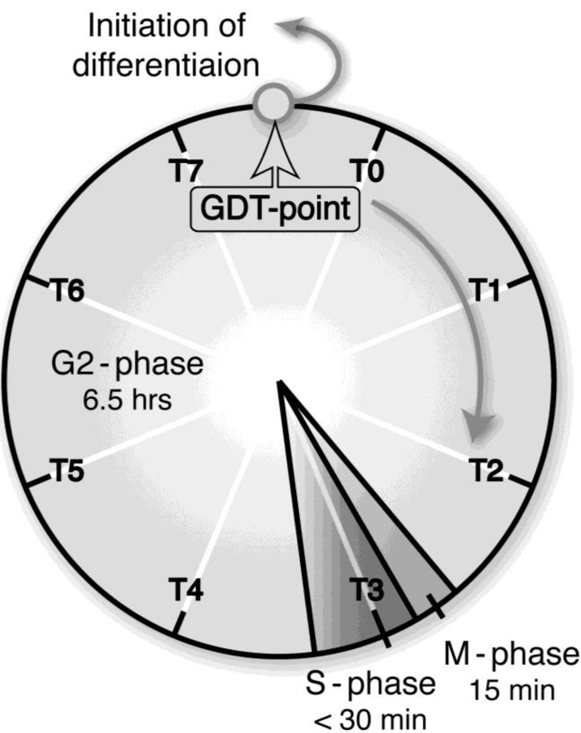 A growth/differentiation checkpoint (GDT point) in the cell cycle of a Dictyostelium discoideum Ax-2 cell. The doubling time of axenically growing Ax-2 cells is about 7.2 h and most of their cell cycle is composed of G2-phase with little or no G1-phase and a short period of M- and S-phases. A specific checkpoint (referred to as the GDT point) of GDT is located at the mid–late G2-phase (just after T7 and just before T0). Ax-2 cells progress through their cell cycle to the GDT point, irrespective of the presence or absence of nutrients, and enter the differentiation phase from this point under starvation conditions [2]. T0, T1, and T7 indicates 0, 1, and 7 h, respectively, after a temperature shift from 11.5 °C to 22.0 °C for cell synchrony. The absence of G1 phase in the Dictyostelium cell cycle is not so strange, because there is little or no G1 phase in rapidly dividing cells such as animal cells at the cleavage stage, and also in the true slime mold Physalum and Hydra. (Basically from Maeda [3]).