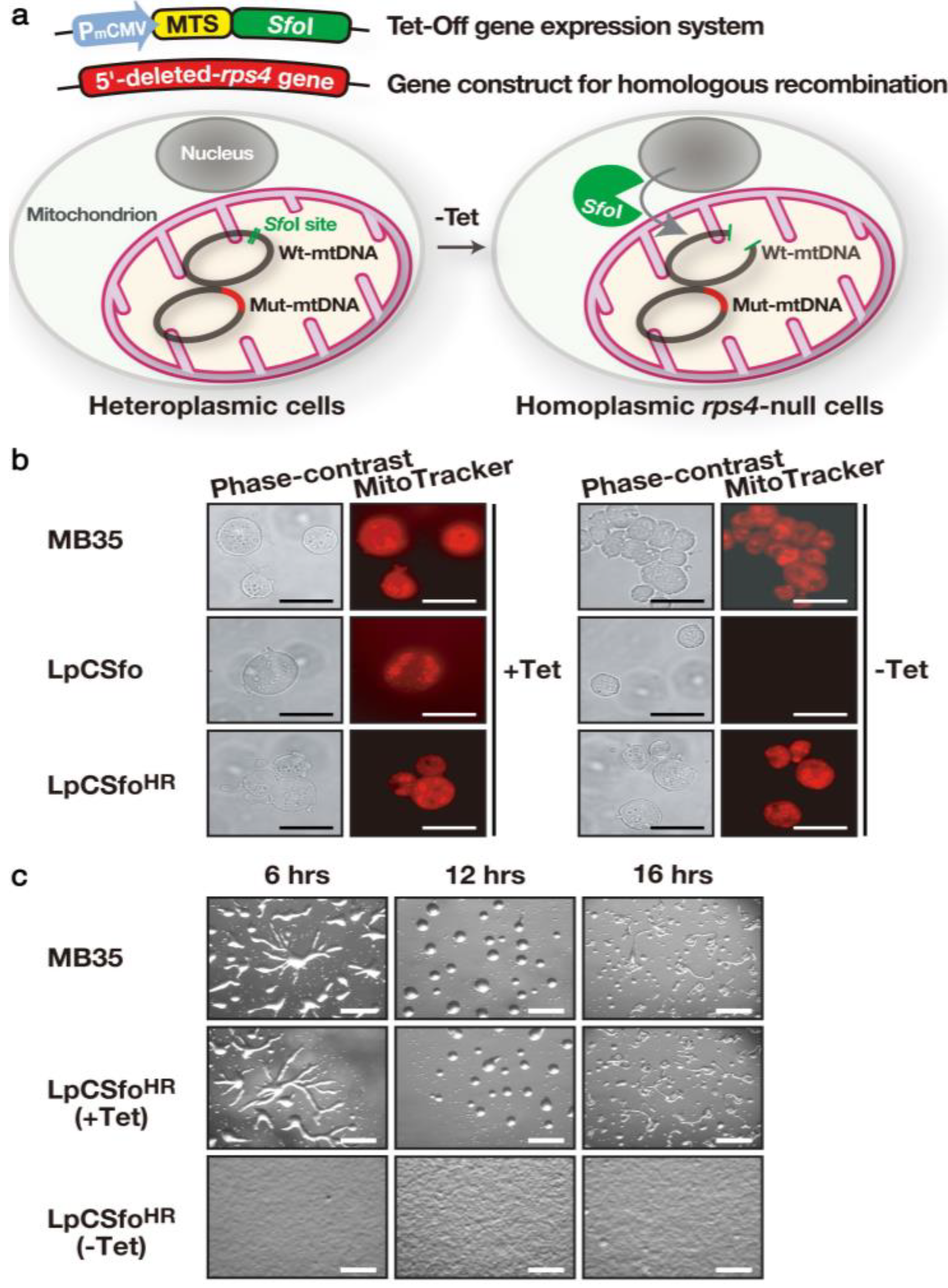 Provided that it is possible to completely inactivate rps4 expression, the rps4-null cells should never differentiate from the GDT point in response to starvation. To test this, we have explored a new method for specifically disrupt a mitochondrial gene (rps4), by a combination of homologous recombination and delivery of an appropriate restriction endonuclease (SfoI) into mitochondria [22]. First, mitochondrially targeted SfoI (i.e., mitochondrial targeting sequence (MTS)-SfoI fusion protein) whose expression is under control of the tetracycline (Tet)-regulated gene expression system was introduced into cells heteroplasmic with respect to the rps4 gene. The heteroplasmic cells were produced by homologous recombination by use of the construct in which the unique SfoI site and 5'-half of the rps4 coding region were deleted not to be digested by SfoI, and therefore their mitochondria have both the wild-type mtDNA and the mutant mtDNA with the disrupted rps4 gene (Figure 3a). In response to removal of Tet from growth medium, SfoI is selectively delivered into mitochondria and digests only the wild-type mtDNA but not the mutant mt-DNA, thus giving rps4-null cells with only the mutated mtDNA, under the Tet-minus condition. A starting material, LpCSfo cells in which pCoxIV (MTS of cytochrome c oxidase subunit IV)-SfoI is expressed under the Tet-minus condition stop growing in growth medium within 48 h after their transfer to Tet-minus medium, because they are converted to a rho-zero state in which mtDNA is completely eliminated (Figure 3b). However, LpCSfoHR(−Tet) cells (rps4-null cells) have almost the same number of apparently intact mitochondria and are able to grow normally with nearly the same doubling-time, as in the case of parental MB35 cells, indicating that the intact rps4 gene is not required for growth. As expected, starving rps4-null cells (LpCSfoHR(−Tet) cells) exhibit a great delay of differentiation: no sign of cell aggregation is noticed even after 16 h of incubation, though LpCSfoHR(+Tet) cells show normal development (Figure 3c). This strongly suggests that the mt-RPS4 protein and/or mt-rps4 mRNA may be essential for the initiation of cell differentiation. The novel method presented here must provide a powerful tool for precisely determining the functions of individual mitochondrial genes as well as for genetic therapy of mitochondrial diseases.