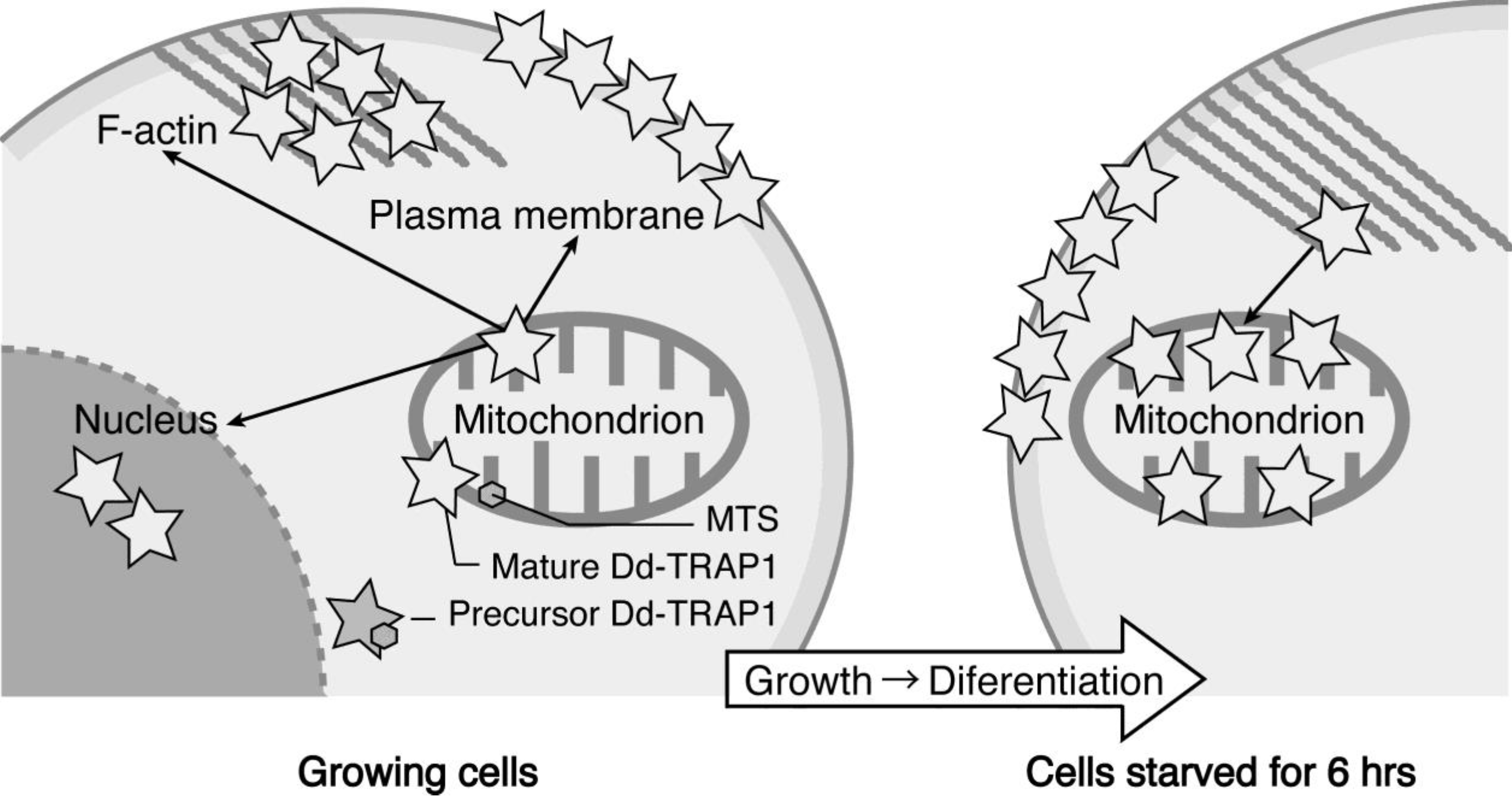 We have demonstrated that the Dictyostelium homologue (Dd-TRAP1) of TRAP-1 (tumor necrosis receptor-associated protein 1), which is a molecular chaperone belonging to the heat-shock protein 90 (Hsp90) family, translocates from the cell cortex to mitochondria as the density of growing cells increases, which allows the prompt transition of cells from growth to differentiation through a novel prestarvation factor (PSF-3) in growth medium (Figure 4) [23,24]. When Ax-2 cells growing at low cell density (5 × 105 cells/mL), in which Dd-TRAP1 is localized in the cell cortex, were harvested and incubated in conditioned growth medium in which Ax-2 cells had been grown up to the late exponential growth phase (and therefore contained a sufficient amount of PSF- 3), Dd-TRAP 1 was found to quickly translocate to mitochondria within 1 min of incubation even at low density. As described above, when cells growing at a high cell density (5 × 106 cells/mL) are transferred to fresh growth medium, their differentiation competence, acquired by the prestarvation response (PSR), is lost within 30 min of incubation [25]. Similarly, when Ax-2 cells growing at the late exponential growth phase (8 × 106 cells/mL) are transferred to fresh growth medium, Dd-TRAP1 located in mitochondria quickly returns to the cell cortex within 30 min of incubation in fresh growth medium [24].