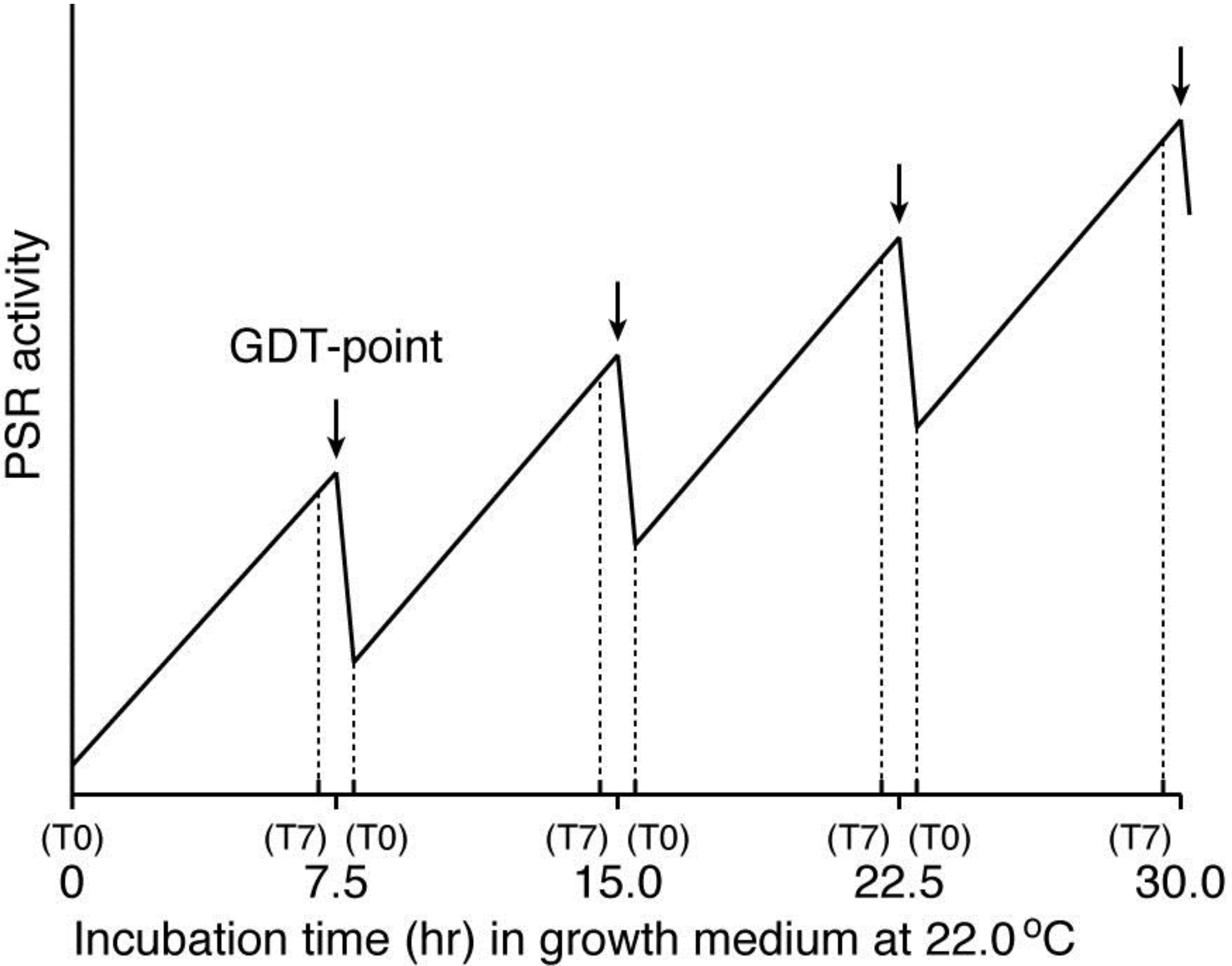 A working hypothesis for explaining the existence of the GDT-point in the Dictyostelium cell-cycle, by assuming a temporally oscillating PSR activity during synchronized cell growth. This model is based on the fact that there is a good correlation between the expression patterns of the prestarvation (PS) genes and the GDT point-specific genes, and is also constructed from the presumption that the amount of PSFs (i.e., PSF activity) in an ideally synchronized cell population may oscillate in a cell-cycle dependent manner during growth, as shown here. The cell-cycle positions of T0 and T7 offer themselves repeatedly during the course of a completely synchronized growth (see Figure 2). The PSR activity reaches the maximum value at the GDT-point (arrow between T7 and T0) in each cell cycle. Although it is presently unknown whether the expressions of Dd-TRAP1 and/or the amount of PSF-3 actually oscillate in a cell-cycle dependent manner, increasing their basal levels during the progression of synchronous cell growth, this issue remains to be examined in future. The horizontal axis of this figure represents incubation time (h) of an ideally synchronized D. discoideum (Ax-2) cell population in growth medium at 22.0 °C. T0 and T7 indicates 0 and 7 h, respectively, after a temperature shift from 11.5 °C to 22.0 °C for cell synchrony, and these are repeatedly represented during a prolonged time of synchronized culture.