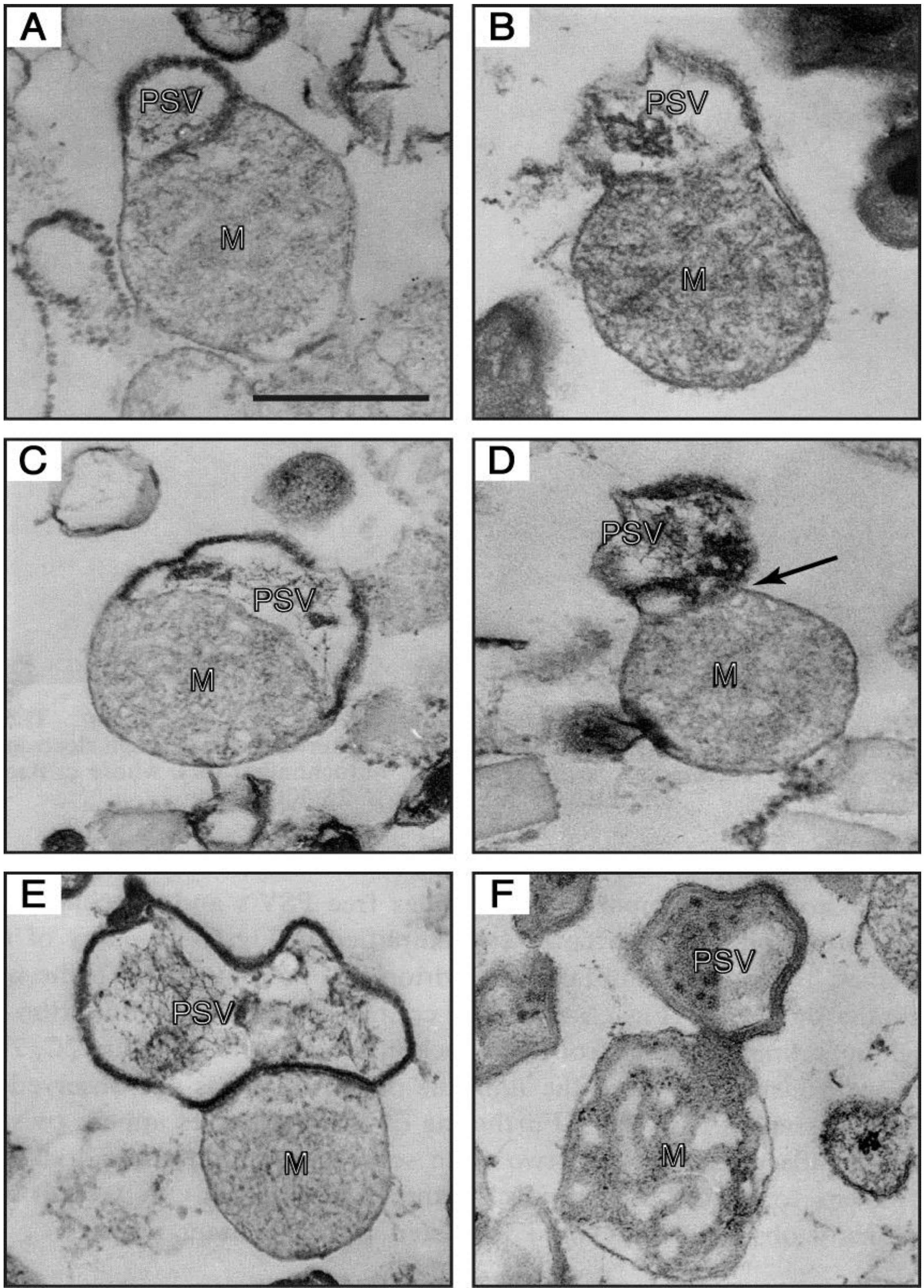 Electron-micrographs of PSV-mitochondrion complexes present in a 47.5%–50% fraction (the intermediate fraction between a lighter pure mitochondria and a heavier pure PSV fractions) of a multilayered sucrose gradient for cell fractionation. (A,B) the outer membrane of a mitochondrion (M) is continuous with the unit membrane of a PSV. (C) a PSV and a mitochondrion are partitioned by a single membrane derived from either the PSV or the mitochondrion, and the electron-dense lining membrane of the PSV is not observed at the contact region. (D) a PSV appears twisted at the contact region (arrow). (E) a completely formed PSV is in close contact with a mitochondrion. (F) a mitochondrial part itself loses its inner structural integrity and seems to be transformed into the PSV. Bar, 500 nm. (From Maeda [49]).