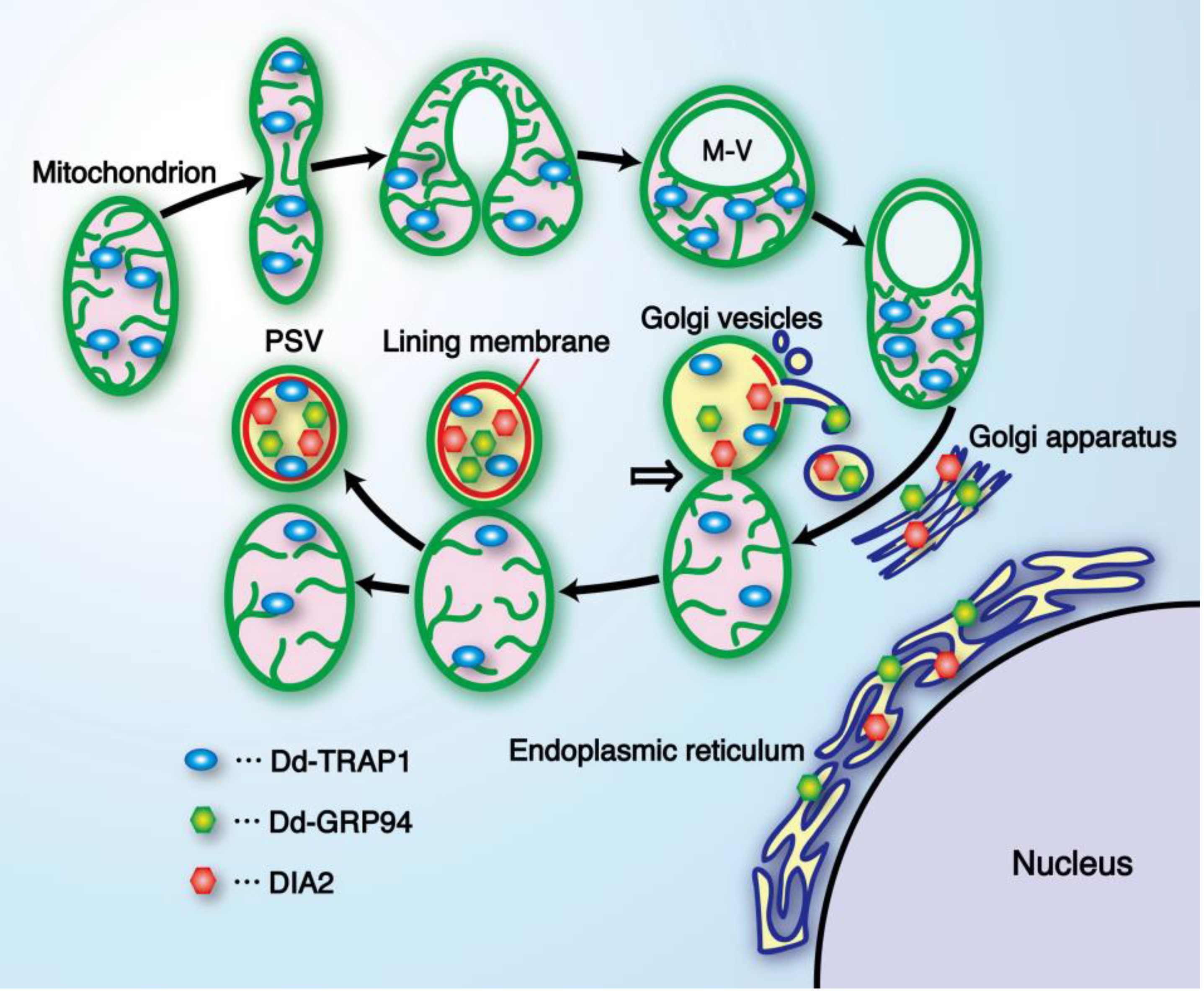 A diagrammatic representation showing formation of the prespore-specific vacuole (PSV) from a mitochondrion and Golgi vesicles. Prior to PSV formation, mitochondria in differentiating prespore cells undergo drastic transformation to form a sort of vacuole (M vacuole), and some Dd-TRAP1 molecules translocate into the M vacuole. Subsequently, Golgi vesicles containing DIA2, Dd-GRP94 and other materials required for PSV formation fuse with the M vacuole, thus resulting in formation of the lining membrane (red) and the internal fibrous structure in the M vacuole. The mitochondrion-PSV complex is eventually twisted at the junction (arrow) and detached to form the respective organelles. Interestingly, almost all of the DIA2 molecules are selectively translocated to PSVs (possibly M vacuoles) in differentiating prespore cells, and seem to be required for exocytotic secretion of PSVs to form the outer-most membrane of spore cell wall [15]. M-V, M vacuole; GRP94, glucose-regulated protein 94 (endoplasmic reticulum Hsp90). (Slightly modified from Maeda [12]).