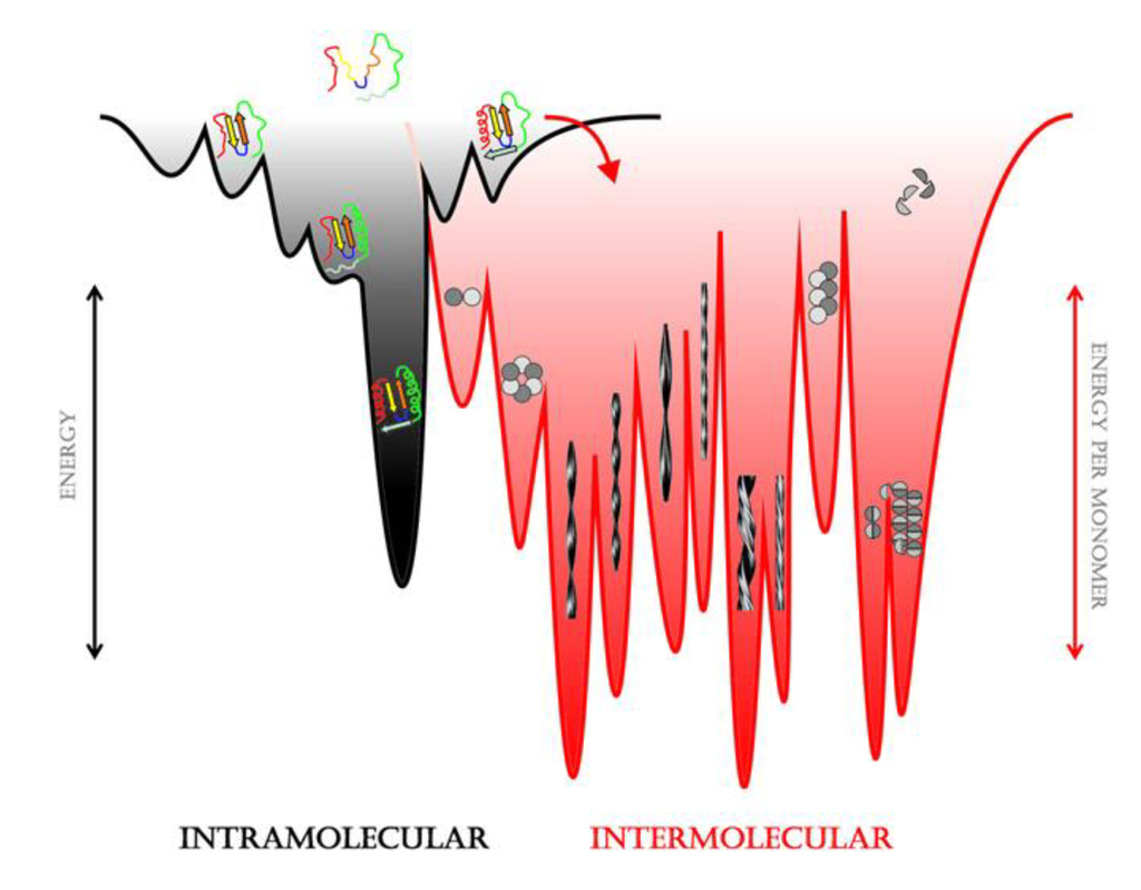 Since even globular protein conformations are not static and many possible conformations may exist, one can look at energy landscapes to provide insight into misfolding. Although fully unfolded proteins can aggregate, some conformations, which are more native-like and not separated by a large free energy barrier (illustrated as N* in Figure 1) may be of particular importance to aggregation under more physiological conditions [].