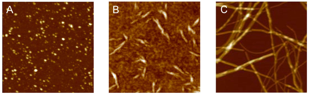 Atomic force microscopy images of representative steps of amyloid aggregation: (A) oligomers; (B) protofibrils; (C) mature fibrils. Scan size 1.0 µm. Z range (A) 8.0 nm; (B) 15 nm; (C) 20 nm. Relini, unpublished results.