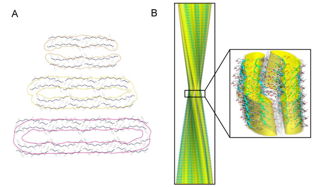 From a structural point of view, evidence has been accumulating showing that the cross-β architecture can be achieved in many ways by the polypeptide chain, which can assume different arrangements in the amyloid fibril. The region of the chain directly involved in the cross-β structure can encompass a small or large portion of the chain, even the whole chain for small peptides, giving rise to a variety of structures [].