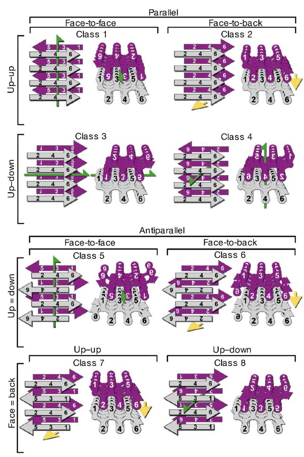 The eight classes of steric zippers (for details see text). Green arrows show two-fold screw axes, and yellow arrows show translational symmetry. Adapted by permission from Macmillan Publishers Ltd.: NATURE, Sawaya M.R. et al., Atomic structures of amyloid cross-β spines reveal varied steric zippers. 447, 453–457, copyright 2007. [].