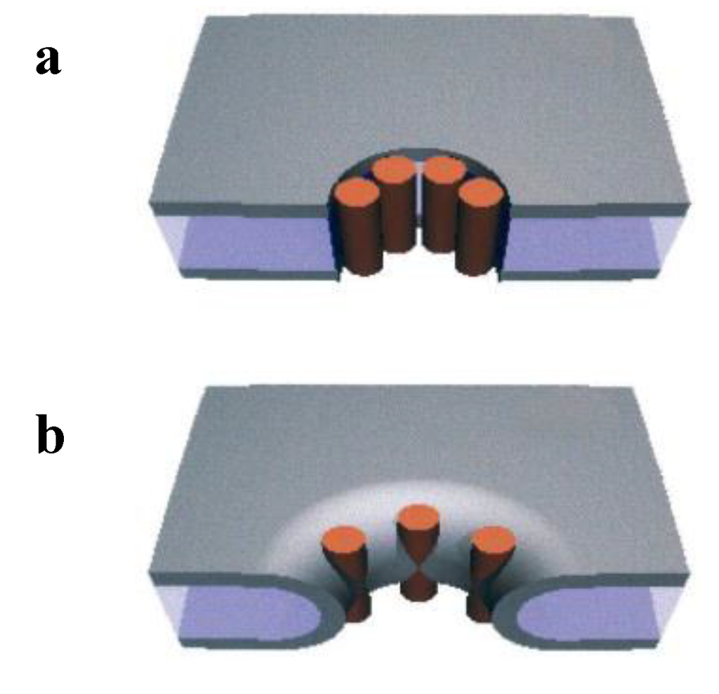 Two possible models for pores (a) Barrel-stave pore; (b) Toroidal pore. Reprinted from The Biophysical Journal, 81, Yang, L.; Harroun, T.; Weiss, T.; Ding, L.; Huang, H. Barrel-stave model or toroidal model? A case study on melittin pores, 1475–1485. Copyright 2001 with permission from Elsevier [].
