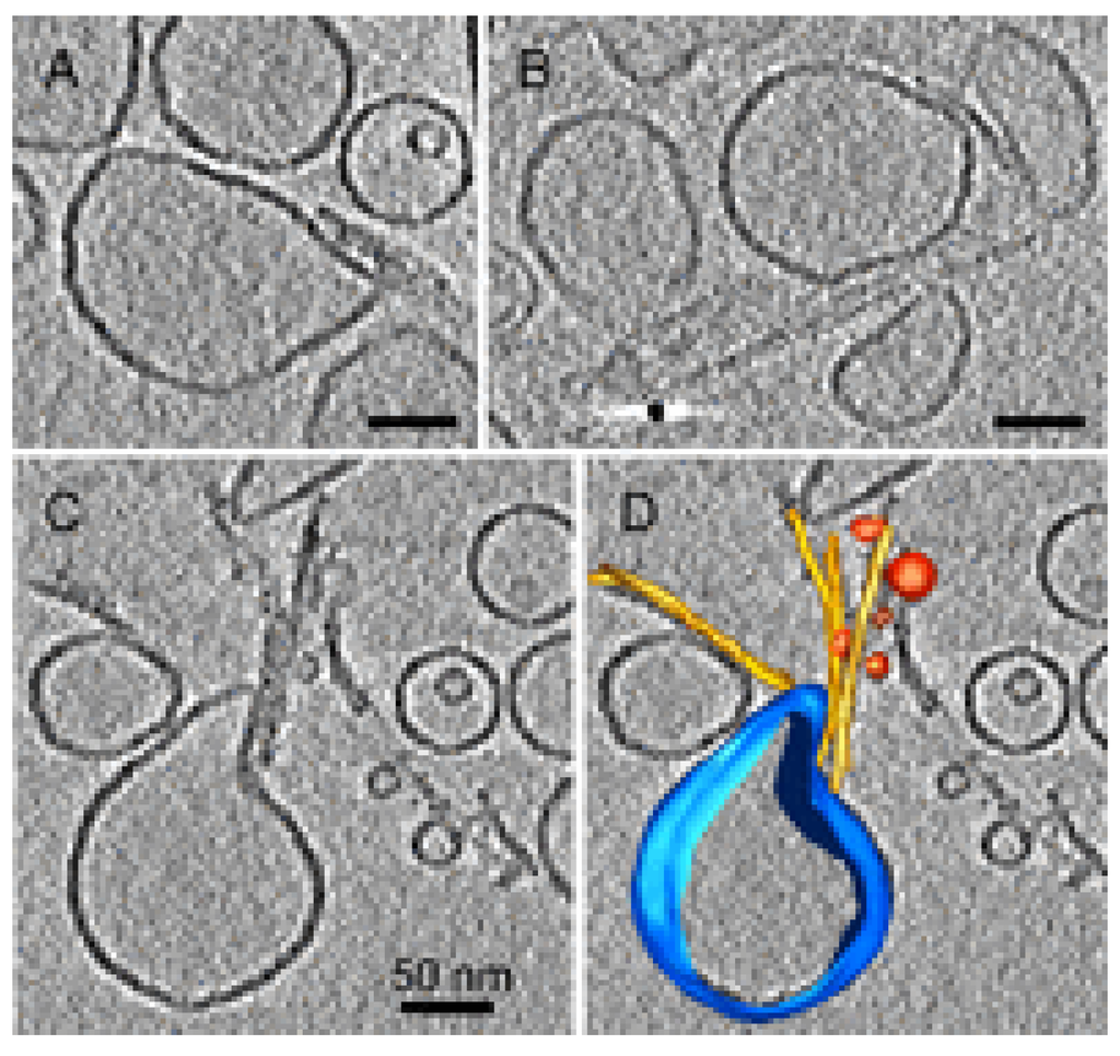 Distortion of liposomes caused by fibril of β2-microglobulin visualized by cryoelectron tomography (A–C) sections of tomogram; (D) rendered 3D model of (C). (C,D) also show blebbing. Modified from Milanesi, L. et al., Proc. Natl. Acad. Sci. USA 2012, 109, 20455–20460. Copyright Milanesi, L. et al. 2012 [].
