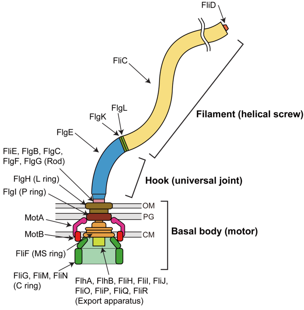 Schematic diagram of the bacterial flagellum. The flagellum is a locomotive organelle for bacterial propulsion. The flagellum consists of the basal body, which acts as a reversible rotary motor, the hook, which functions as a universal joint and the filament, which works as a helical screw. OM, outer membrane; PG, peptidoglycan layer; CM, cytoplasmic membrane.