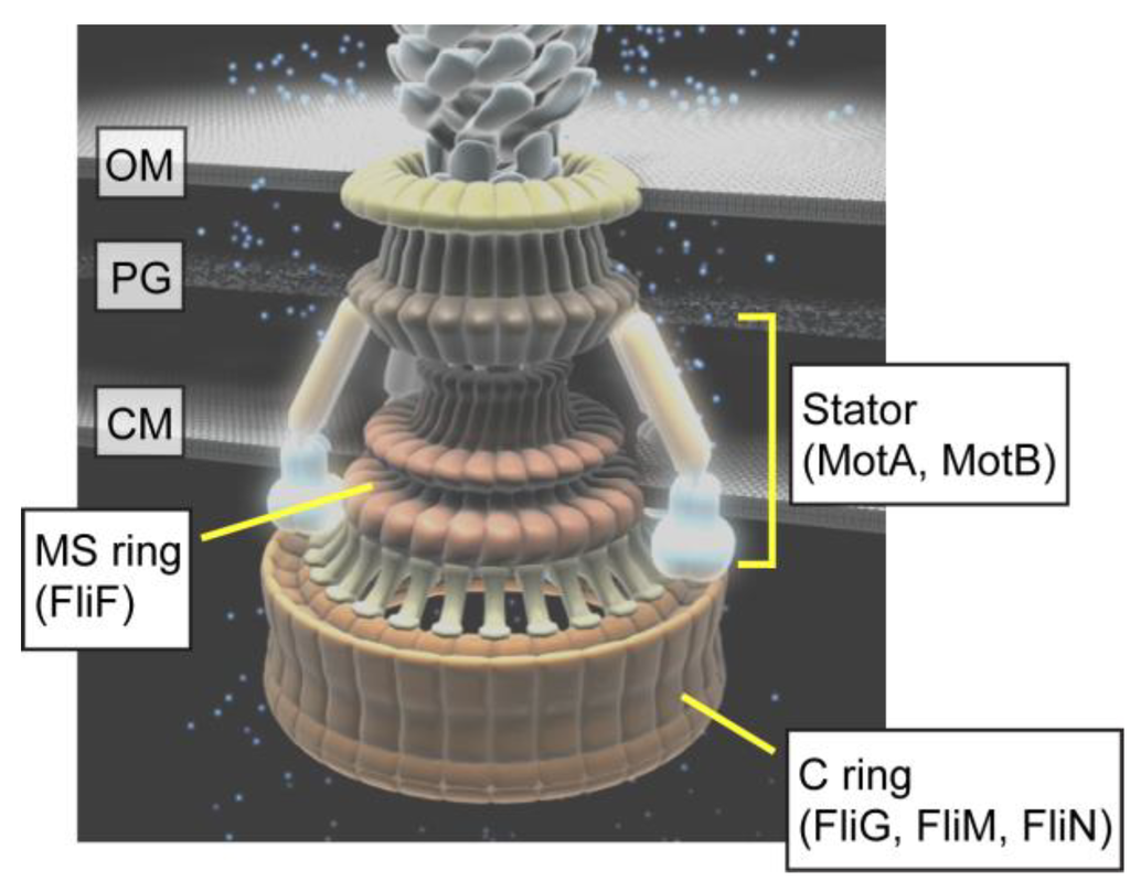 Schematic diagram of the proton-driven bacterial flagellar motor. The flagellar motor consists of a reversible rotor made of FliF, FliG, FliM and FliN and a dozen stators, each of which consists of MotA and MotB. FliF forms the MS ring within the cytoplasmic membrane. FliG, FliM and FliN form the C ring on the cytoplasmic face of the MS ring. OM, outer membrane; PG, peptidoglycan layer; CM, cytoplasmic membrane.