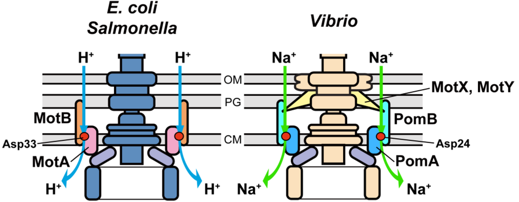 Schematic diagrams of the bacterial H+-driven and Na+-driven flagellar motors. E. coli and Salmonella have the H+-driven flagellar motor (left) whereas Vibrio alginolyticus has the Na+-driven polar flagellar motor (right). The stator of the flagellar motor consists of MotA and MotB in the H+-driven motor and of PomA and PomB in the Na+-driven motor. MotX and MotY are required for efficient assembly of the PomA/B complex around the motor in Vibrio.