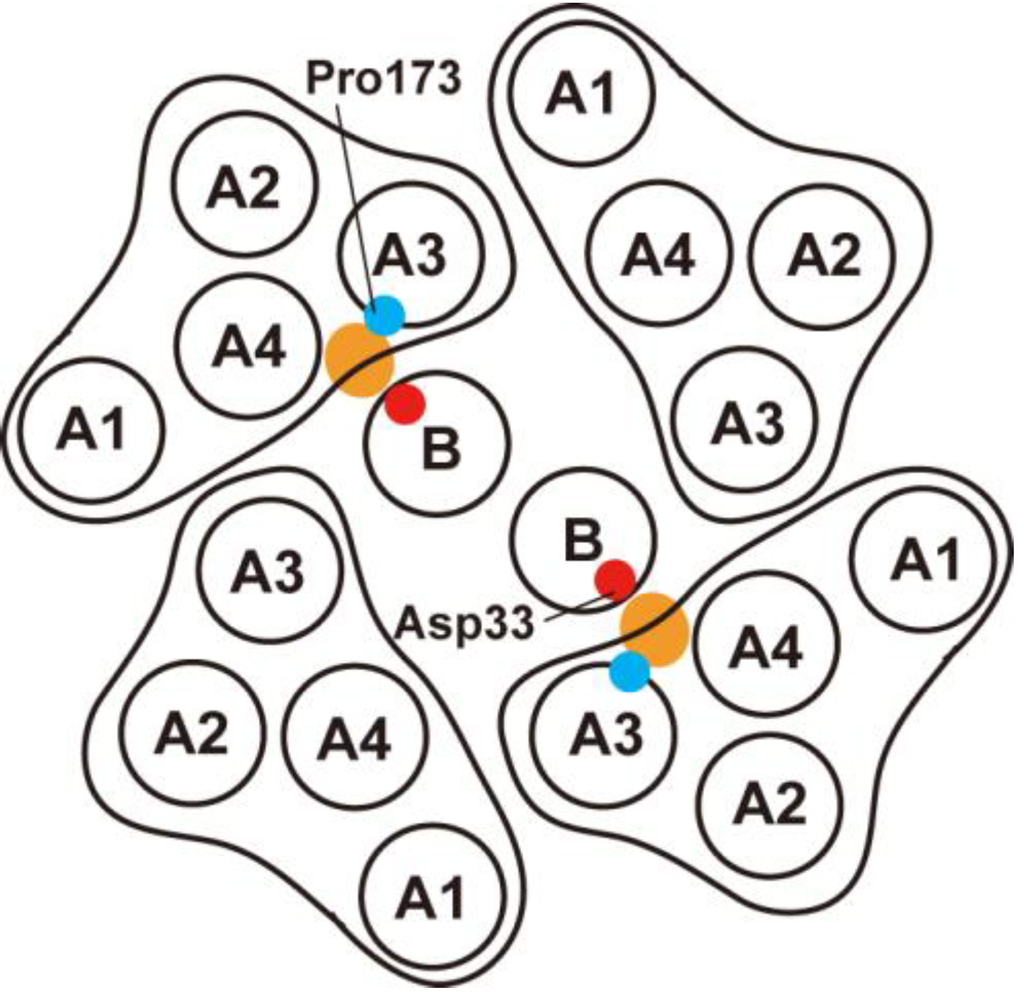 Arrangement of transmembrane segments of the MotA/B complex, which consists of four copies of MotA and two copies of MotB. The view is from the periplasmic side of the membrane. The complex has two proton conducting pathway shown by orange ellipsoids [,,].
