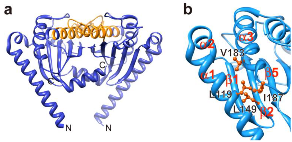 The crystal structure of MotBC from Salmonella. (a) Cα ribbon representation of Salmonella MotBC dimer in the crystal (PDB ID: 2ZVY). The peptidoglycan binding (PGB) motif is shown by orange. (b) The MotBC structure in the vicinity of Leu119. Leu119 in helix α1 shows hydrophobic interactions with Leu149 in strand β2 and Val183 and Ile187 after helix α3.
