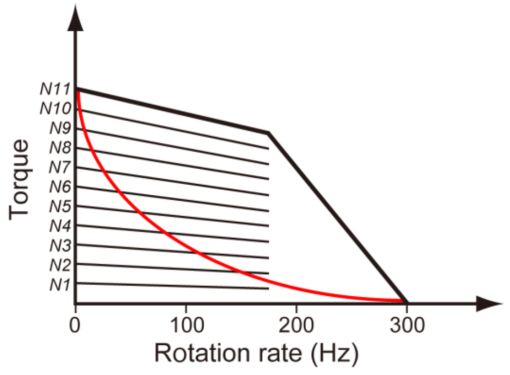 Torque-speed curves of the wild-type (black line) and MotB(∆72–100) mutant motors (red line). Torque-speed curves of the wild-type motor with different number of stator units are indicated (N1–N11).