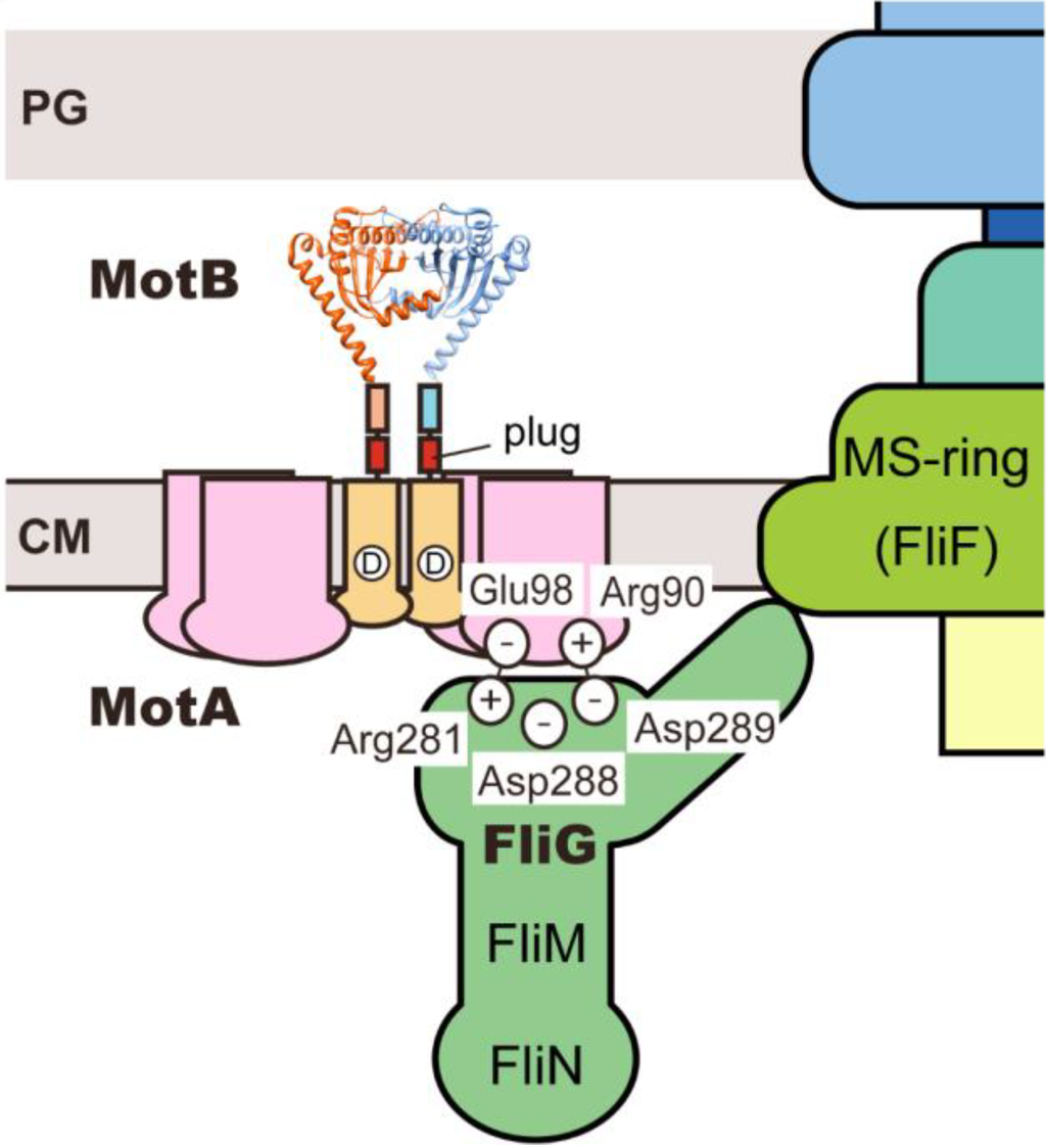 Schematic diagram of interactions at the rotor–stator interface. FliG is postulated to occupy the upper part of the C ring. The interactions between MotA-Arg90 and FliG-Asp289 and between MotA-Glu98 and FliG-Arg281 are directly involved not only in torque generation but also in stator assembly around the rotor.