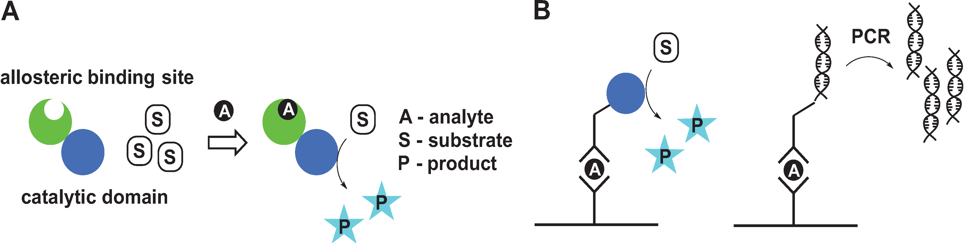Small molecule sensors have a broad range of applications ranging from metal tracking in vivo to detecting chemicals in food and the environment. One common strategy for sensor design utilizes conformational switches that change their structure upon analyte binding, resulting in a change in fluorescence of reporter groups [1,2,3,4,5,6,7,8,9,10,11]. Another approach, which is the focus of this review, is based on catalytically amplified sensing in which allosteric [12] binding of an analyte triggers conformational changes, which in turn modulates catalysis at the active site (Figure 1A). This method effectively links a single analyte binding event with production of multiple molecules of colored and/or fluorescent product that can be easily measured. Owing to the large signal amplification, catalytically amplified sensing provides a significant sensitivity advantage over sensors that rely on fluorescence turn-on due to change in relative orientation of reporter groups. Some of the best-known examples of catalytically amplified sensors are enzyme-linked immunosorbent assay (ELISA) [13,14,15] and immuno-polymerase chain reaction (IPCR) [16,17]. ELISA is a plate-based assay designed to identify and quantify biological analytes, including proteins, peptides and hormones. While ELISA assays are not purely allosteric, they demonstrate nicely the concept of signal amplification through catalysis (Figure 1B). An antibody immobilized on a solid support selectively interacts with antigen in the liquid sample. After removal of unbound antigen the plate is treated with antigen-specific antibody conjugated to an enzyme that produces a colored or luminescent product. A variety of enzymes can be used to amplify the signal, but the most common enzyme is horseradish peroxidase (HRP) in combination with 3,3',5,5'-tetramethylbenzidine (TMB) or 2,2'-azino-bis(3-ethylbenzothiazoline-6-sulfonic acid) (ABTS), which produce colored product in the presence of H2O2. IPCR combines the versatility of the ELISA approach with the sensitivity of PCR. In IPCR, an antibody is linked to DNA instead of the enzyme (Figure 1B) and the signal is amplified exponentially using a polymerase chain reaction [18,19,20]. DNA amplicons generated by PCR can be quantified by gel electrophoresis or real-time fluorescence measurements [20,21] improving detection limit by 100–100,000-fold as compared to ELISA.