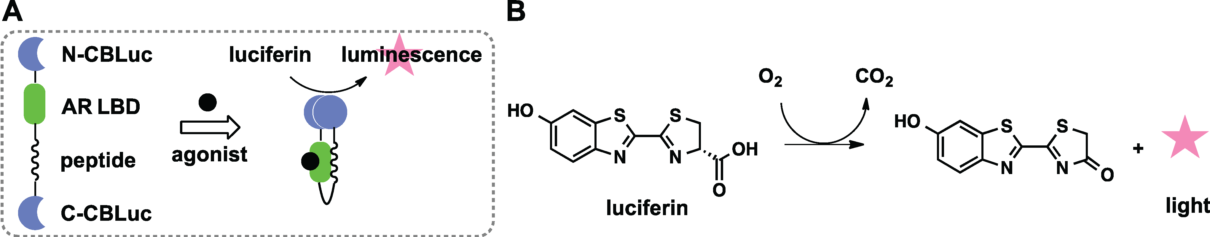 Bioluminescent sensor for agonist detection based on complementation strategy of split CBLuc. (A) Luciferase was split in two halves that reassemble when agonist is present. The enzyme domain is in blue, the allosteric binding domain is in green, and the signal that modulates the switch is shown as a black sphere; (B) Oxidation of luciferin promoted by luciferase generates bioluminescent light.
