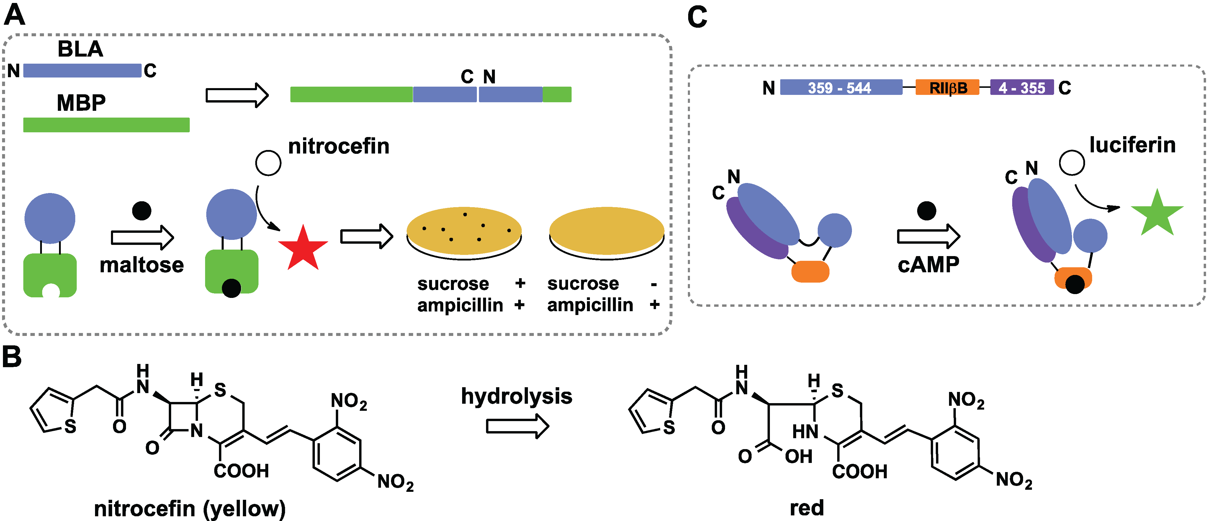 Insertion of one protein into another using circular permutation. (A) β-lactamase (BLA) was first permuted and then inserted into maltose binding protein (MBP), binding of maltose induces conformational changes that trigger hydrolysis of nitrocefin into a red product. Plating cells expressing the switch on β-lactam antibiotics allows engineering of probes responsive to ligands other that maltose; (B) Nitrocefin hydrolysis catalyzed by β-lactamase produces a red product; (C) Firefly luciferase engineered to detect cAMP. Binding of analyte to RIIβB promotes conformational change that increases bioluminescence.