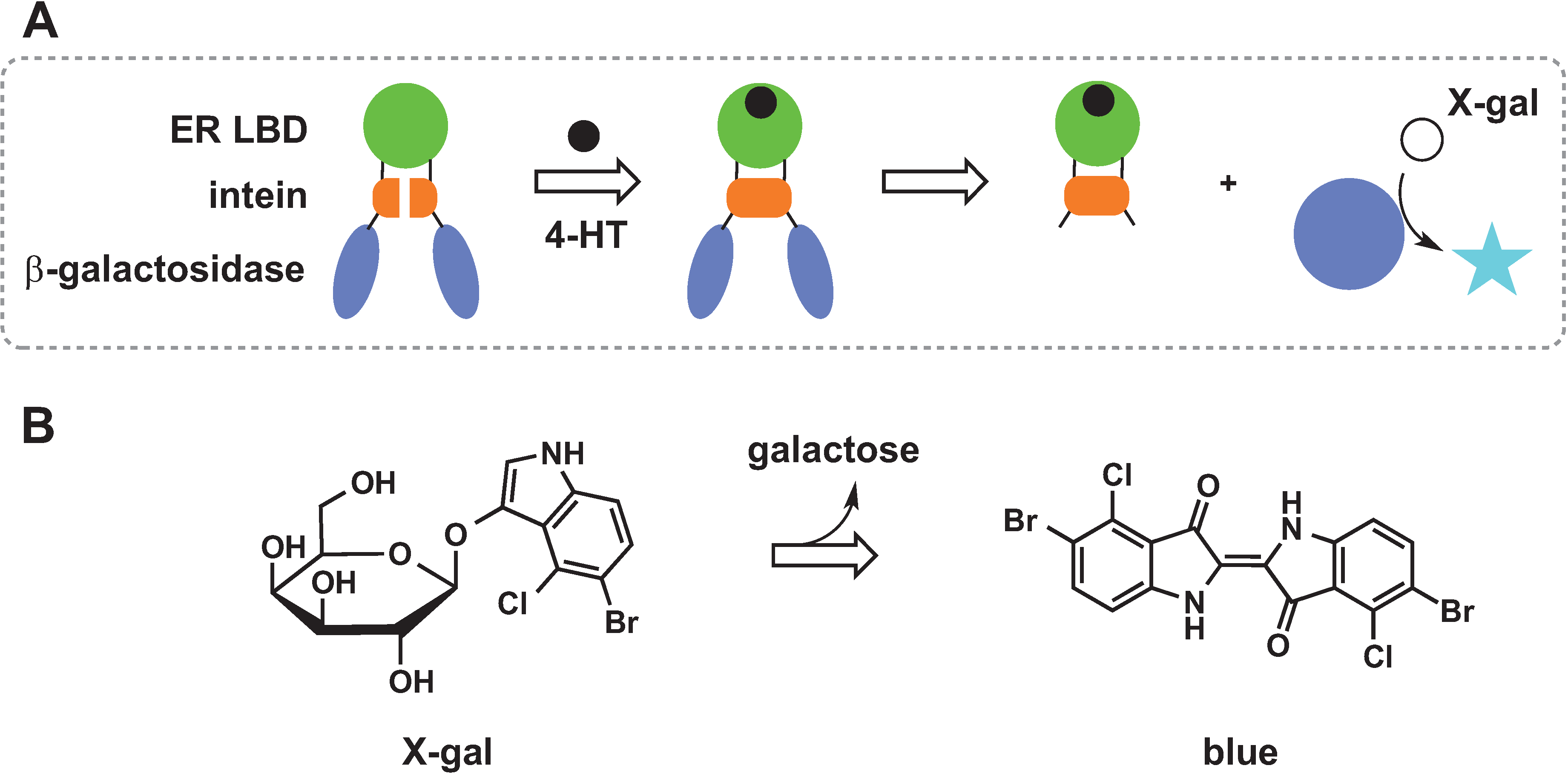 Sensor design based on protein splicing. Ligand binding domain (ER LBD), intein, and β-galactosidase enzyme are fused together so that binding of the ligand activates splicing of the enzyme (A), which then catalyses X-gal hydrolysis and formation of a blue product (B).