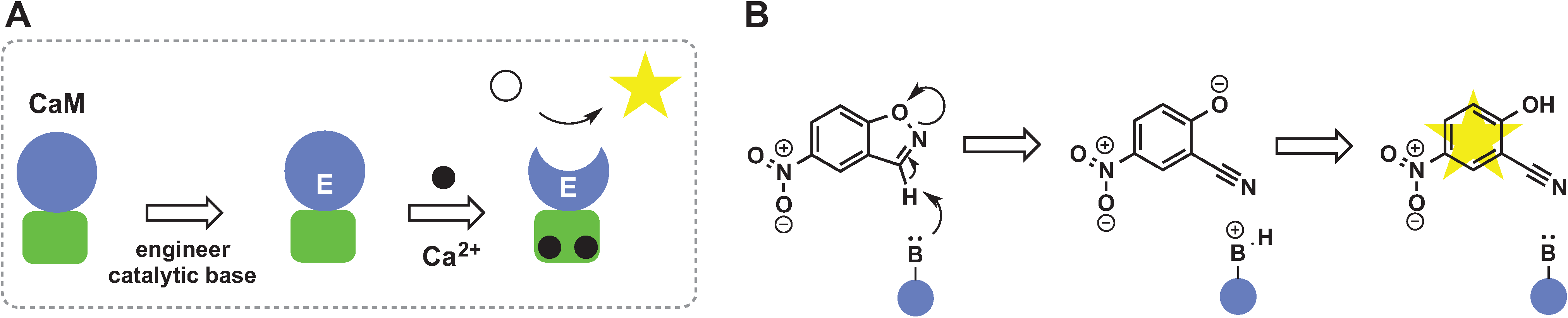 The general principle of Ca2+ detection using calmodulin (CaM) engineered to catalyze Kemp elimination. (A) CaM undergoes structural changes upon Ca2+ binding that lead to formation of a hydrophobic pocket. Introduction of catalytic residue Glu92 into this pocket enabled calmodulin to catalyze the Kemp elimination reaction (B).