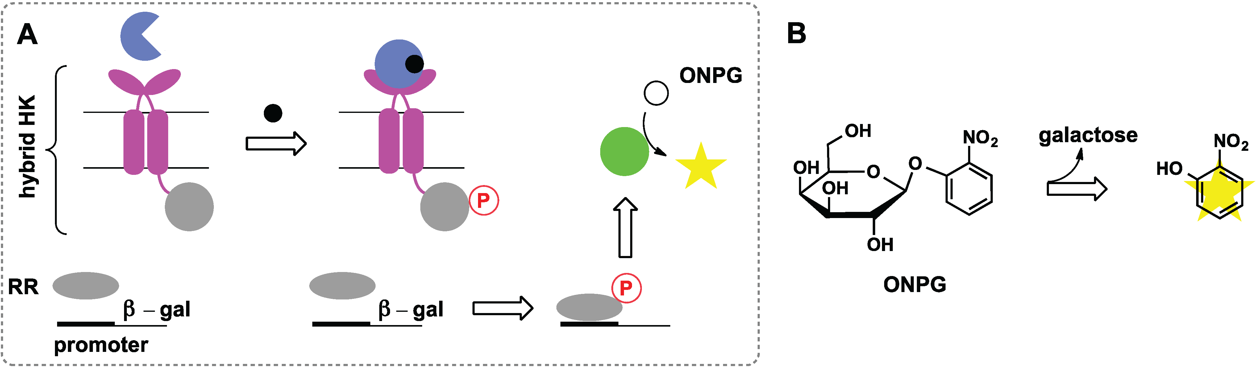 Synthetic two-component pathway that combines redesigned receptor (blue) with chimeric histidine kinase (HK) consisting of periplasmic domain from chemotaxis sensor (pink) and cytoplasmic domain from osmosensor (grey). (A) This chimeric HK phosphorylates response regulator (RR, grey) from osmosensor, which then turns on transcription of the β-galactosidase gene (green); (B) Reaction used to measure β-galactosidase activity. ONPG, 2-nitrophenyl-β-galactopyranoside.