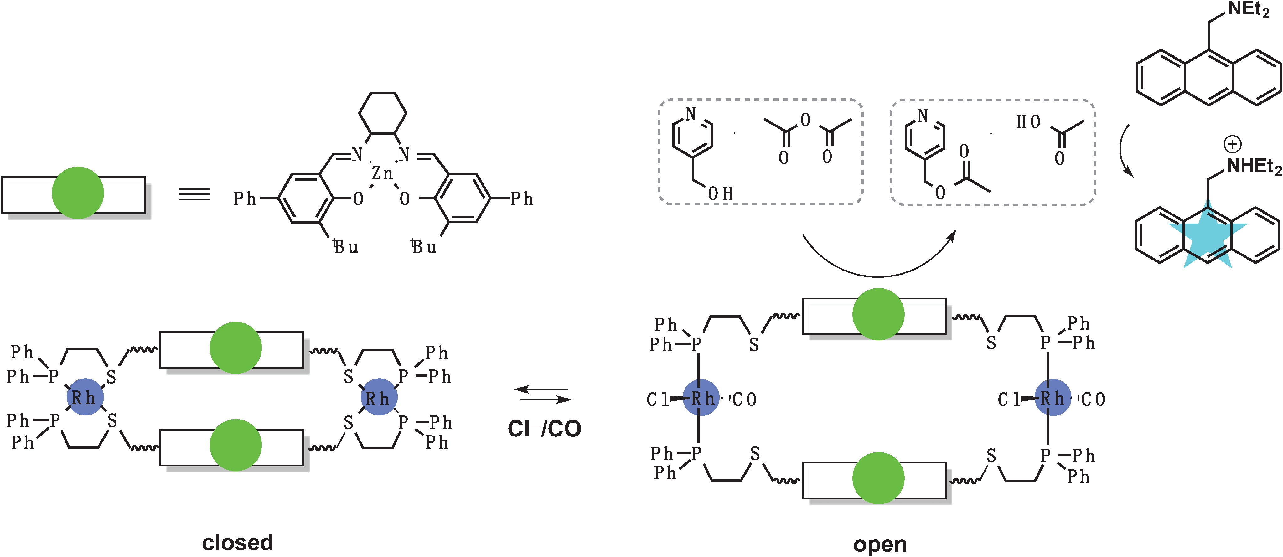 Using a weak-link approach [64,65] Gianneschi et al. created a supramolecular reversible allosteric detection system with catalytically amplified signal that can be activated by small molecules such as Cl− and CO [66]. The recognition part of the sensor is comprised of metal ions (Rh(I) or Cu(I)) bound to flexible hemilabile ligands with sulfur and phosphorus as the donor atoms (Figure 8). The flexible portion of the ligand, which forms the catalytic part of the sensor, contains a Zn-Salen complex that is not sterically accessible in the absence of Cl− and CO. When Cl− or CO bind to the sensor, they displace the thioether sulfurs in the Rh(I) coordination sphere, while keeping stronger Rh-P bonds intact. The resulting coordination sphere rearrangement leads to an extension of the macrocycle cavity (shown as the open state in Figure 8) and subsequent exposure of the catalytic component of the sensor. The rearrangement turns on the catalysis of a transfer reaction between acetic anhydride and pyridyl carbinol. The rate of the reaction is 25-fold higher relative to the background rate in the absence of Cl− and CO. The readout is simplified by the presence of a pH-sensitive fluorophore, which reports how much acetic acid was generated. Reversible switching of the sensor to the closed inactive state was achieved by purging the system with nitrogen or removing CO under vacuum.