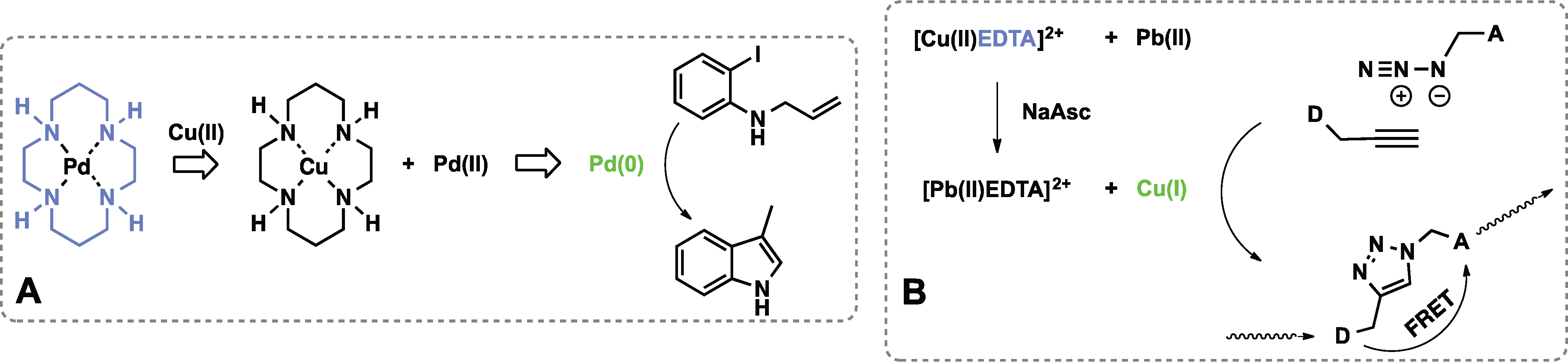 Sensors for metals designed based on differences in ligand affinity. (A) Cu(II) is recognized by cyclam ligand (blue), release of Pd(II) and its in situ reduction by phosphine to catalytic Pd(0) (green) enables the Heck reaction; (B) Free Cu(II) displaced upon Pb(II) binding is reduced to Cu(I) which catalyzes formation of the FRET active product through Huisgen cycloaddition.