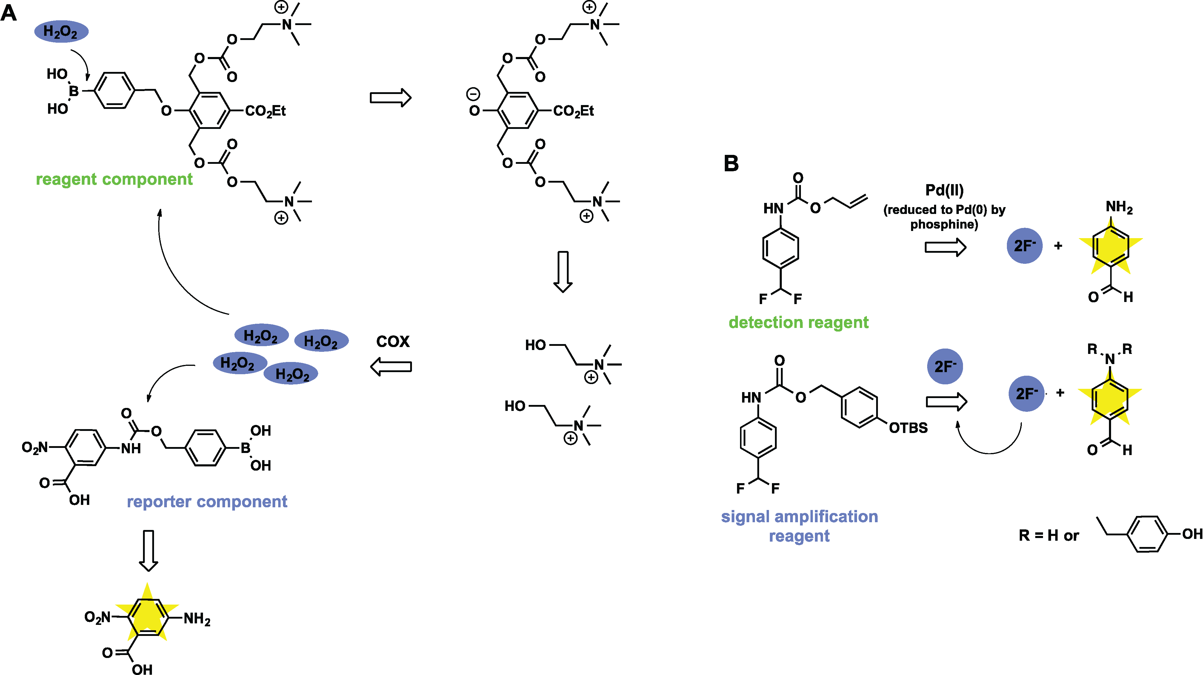 Sensors for H2O2 and Pd(II) that utilize autocatalytic signal amplification. (A) A molecule of H2O2 triggers cleavage and disassembly of reagent component, the process which in combination with COX catalysis produces many more H2O2 and initiates a dendritic chain reaction; (B) Pd(II) reacts with detection reagent with release of F−, which in turn reacts with amplification reagent and produces more F− in an autocatalytic fashion.