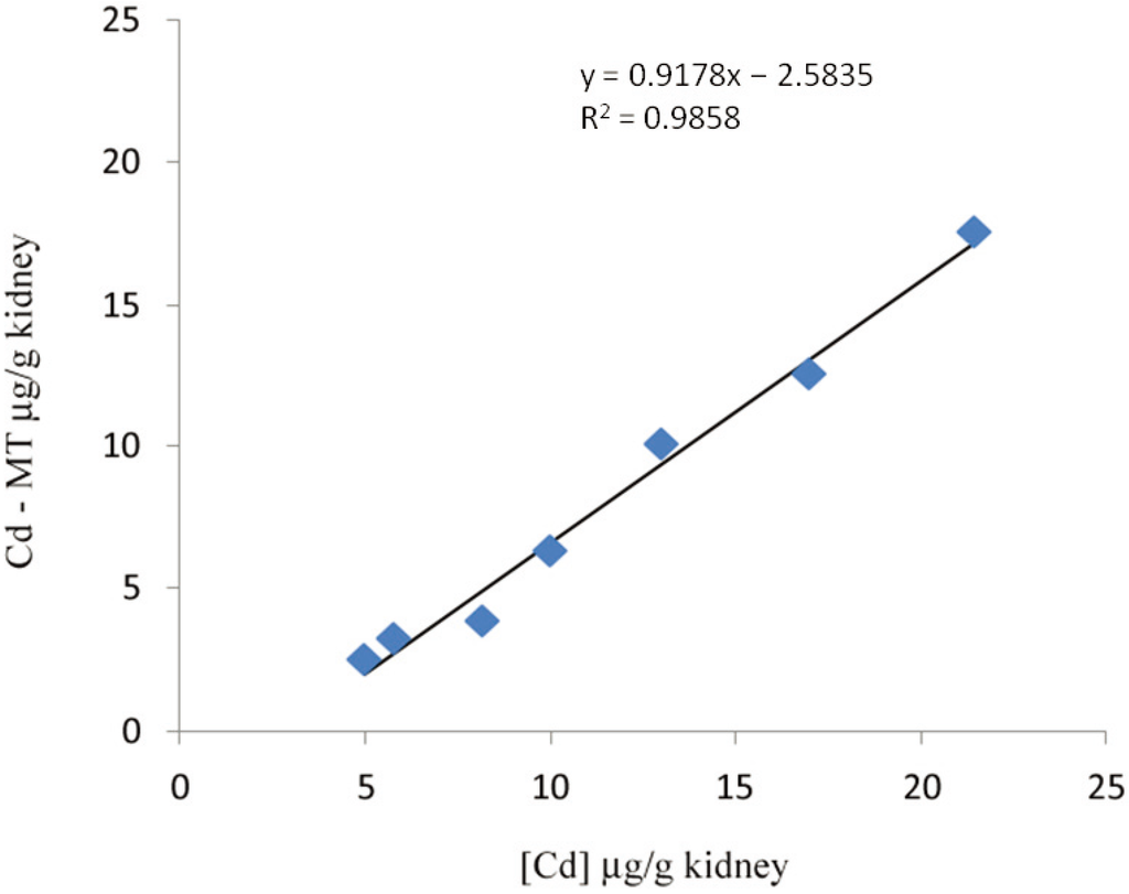 MT quantification methods are based either on direct protein measurement or indirect determination. Additional methods rely on monitoring MT-mRNA by real time PCR, a technique able to distinguish different isoform transcripts, but these do not always match with the corresponding thioneins [3]. There is currently no simple MT quantification method, though accurate measurement of the protein is mandatory to understand both its functions and biomarker potential. Recent advances in MT speciation research resulted in a variety of promising techniques, including HPLC-ICP-MS, HPLC-ESI-MS and RP-HPLC coupled to fluorescence detection. However, in spite of the sensitivity and accuracy of these new methods, the analysis of biological samples with these hyphenated techniques requires expensive equipment and well-trained technicians [4]. Size-exclusion liquid chromatography associated with atomic absorption spectrometry for metal analysis is generally used for MT isolation and quantification. Though this method may underestimate MT concentration, it has the great advantage of isolating MT under mild physiological conditions, keeping the protein as intact as possible still binding the metals that were actually bound in vivo [5]. Other common methods based on sulphydryl quantification are easy to perform but lack specificity [6]. Ryvolova et al. [7] recently published an exhaustive review on analytical methods for MT detection including Raman spectroscopy, considered a promising new technique [8]. On the other hand, omitting the complex hyphenated techniques mentioned above, MT can be indirectly quantified in a tissue when a significant correlation is found between metal tissue concentration and MT. An example is reported for CdMT in kidney of Eurasian woodcock (Scolopax rusticola) (Figure 1), where the CdMT can be simply calculated from the metal concentrations in tissue [9].