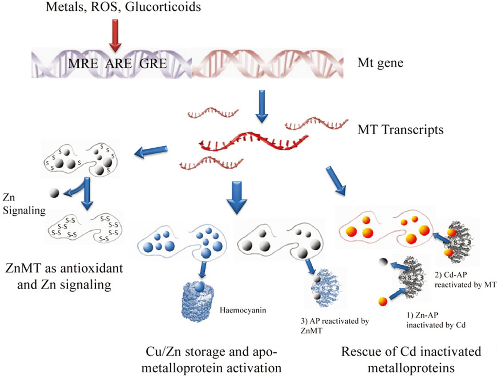 Despite over half a century of research, the exact functions of MTs are still under debate [13,14,15]. Due to the high kinetic mobility of metals within metal clusters, MTs are involved in trace metal exchange (binding/release). The main hypothesized functions (Figure 3) are: (1) homeostasis of the essential trace metals Zn and Cu; (2) detoxification of the non-essential metals Cd and Hg; (3) donation of essential metals to apo metalloproteins; (4) protection against oxidative damage; (5) free radical scavenger as thionein a [16,17]; last but not least, MT could be a multifunctional protein. MT functions can be investigated at different levels of its molecular life spanning from the gene structure and transcription to the thionein degradation. The genomic organization of the MT genes is quite conserved: the typical structure of the coding region includes three exons and two introns. Transcription of metallothionein is regulated in response to different stimuli, particularly heavy metals, oxidative stress and glucocorticoids [13]; accordingly, metallothionein promoter region from most organisms contains specific response sequences termed metal response elements (MREs), antioxidant response elements (AREs) and glucocorticoid response elements (GREs). In this respect, special attention is paid to the metal transcription factor MTF-1 [18], that in turn is a metallo-protein belonging to the zinc-finger family, first discovered in the unconventional amphibian Xenopus laevis [19].