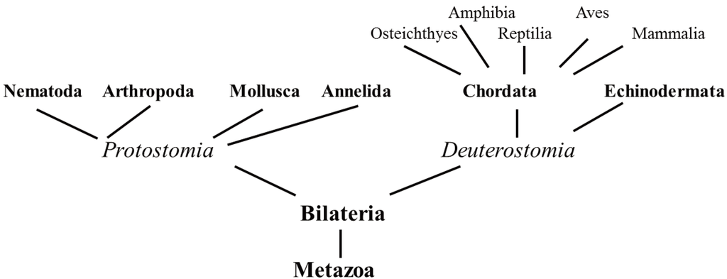 In the past, veterinary medicine was mainly interested in a few species of vertebrate animals of economic importance, large animals for work and food production, dogs and cats as companion animals and their respective pathogens. Nowadays, crustaceans, mollusks and several species of vertebrates are increasingly exploited as pets or as food. As a consequence, veterinary sciences have recently focused on myriad unconventional species spread along the phylogenetic tree. The animal evolutionary tree is still under debate and molecular techniques are often used to explore a large number of sequences, including those of MTs, to analyze the relationships among different species [20,21]. Our review adopted an evolutionary approach, presenting data on selected species from the main Protostomia phyla, Nematoda, Annelida, Arthropoda and Mollusca. From the Deuterostomia we have chosen examples from Echinodermata and Chordata phyla, the latter focused on Vertebrate classes of Osteichthyes, Amphibia, Reptilia, Aves and Mammalia (Figure 4). Last but not least, many of the species we investigated for our metallomic studies belong to these taxonomic groups.