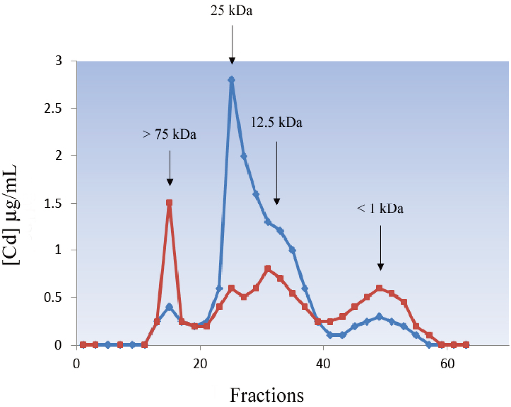 Figure 5. Cd profiles from Mytilus edulis hepatopancreas cytosol after gel filtration chromatography on Sephadex G-75 performed immediately after extraction (blue line) and after 3 days of storage at −20 °C (red line).