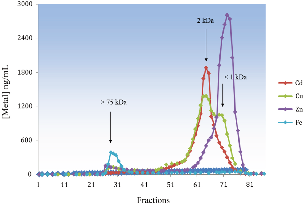 Figure 6. Cd, Cu, Zn and Fe profiles from Octopus liver cytosol after gel filtration chromatography on Sephadex G-75.