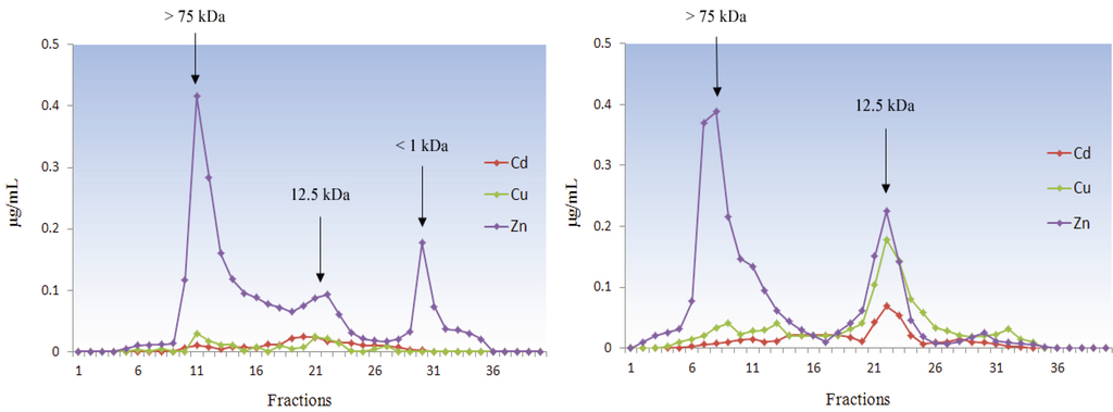 Cephalopods are considered the most intelligent and most complex invertebrates with a well-developed brain and a widespread presence in every marine environment [69]. The presence of MT-like proteins has been reported for Todarodes pacificus [70] and Octopus vulgaris [71,72]. In Octopus fed with mussel previously exposed to waterborne Cd, we found that most of the Cd in cytosolic liver extracts was bound to ligands with a molecular weight lower than that of classic MTs (Figure 6), and estimated to be between two and three kDa. This peak was also rich in Cu and contained a lower percentage of Zn. We assume that MT could be cleaved in small peptides due to the presence of highly active proteases that we failed to inhibit; the presence of a single domain peptide cannot be excluded. Data on cephalopod MTs are controversial. Craig et al. [73] concluded that MTs are probably not involved to a significant extent in metal binding in the squid, Loligo forbesi, whereas Raimundo et al. [72] claimed that the high levels of Zn, Cu and Cd in the digestive gland of O. vulgaris must be ascribed to the presence of MT as suggested by differential pulse polarography determination of the protein, but in this case no molecular weight could be extrapolated.