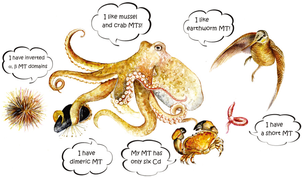 Metallothionein (MT) was first isolated in 1957 from horse kidney [1] and subsequently characterized [2], showing that different isoforms are present depending on the species. MTs are intracellular low molecular weight cysteine-rich proteins characterized by high affinity for d10 electron configuration metals, including essential (Zn and Cu) and non-essential (Cd and Hg) trace elements. MTs are ubiquitous and have been isolated in a wide variety of organisms from bacteria to humans playing a key role in metal metabolism. A PubMed search, using “metallothionein” as key word, yielded more than 10,300 publications since 1960, with an average of around 400 per year in the last decade, on myriad topics from physical chemistry to applied medicine and environmental monitoring. By contrast, less information is available on MTs in unconventional animals. This review considers “unconventional” those species not traditionally studied in human and veterinary medicine, such as snails, octopuses, snakes, turtles, birds and dolphins. Living in different environments, all these animals represent an incredible source of physiological and biochemical adaptations and are of increasing interest in many fields of research, including veterinary and human medicine.